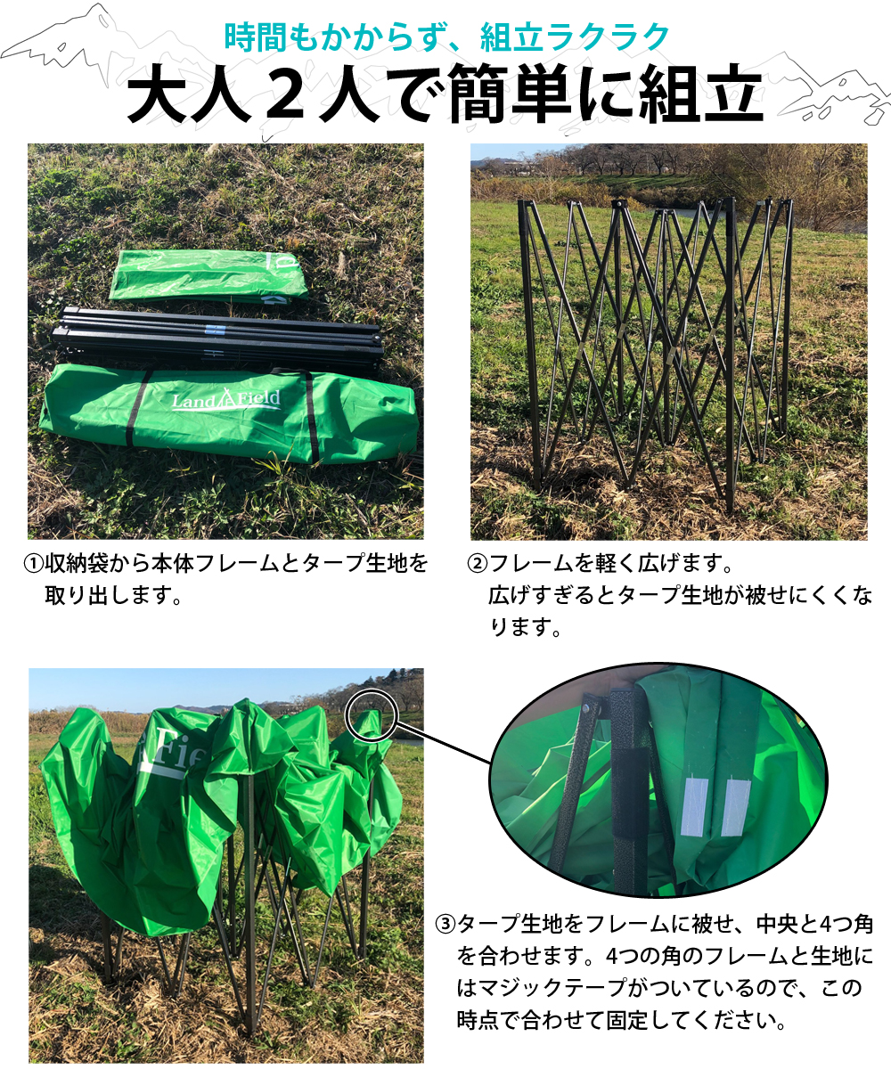 ・風が強い時は設営をおこなわないでください。本体が飛ばされて思わぬ事故や本体が飛ばされ車などにぶつかる可能性がございます。