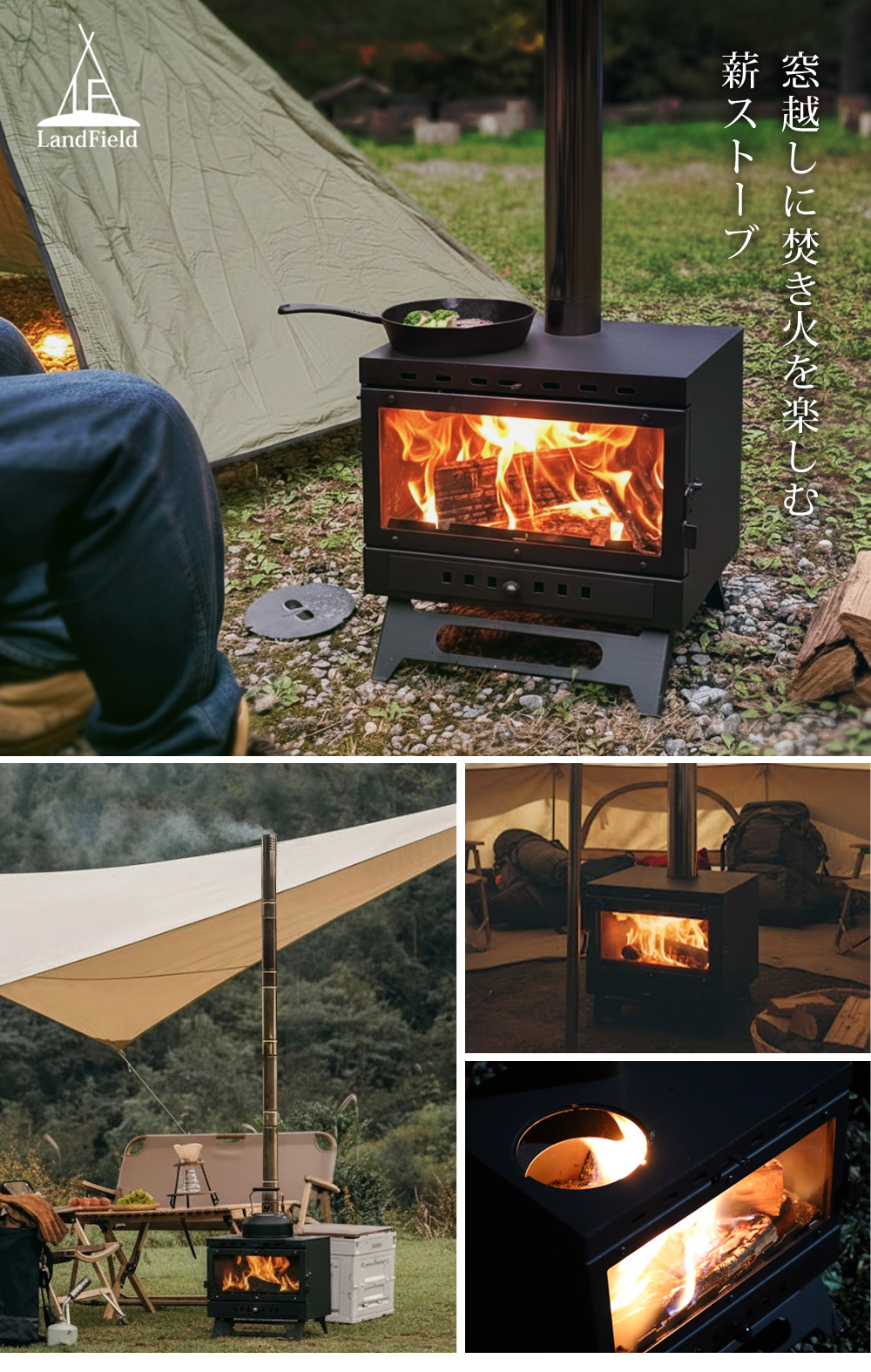 薪ストーブ ガラス窓付き 折りたたみ キャンピングコンロ 煙突 えんとつ 耐熱ガラス 室内 テント 屋外 かまど 竈 焚火 たき火 焚き火 キャンプ アウトドア LANDFIELD ランドフィールド LF-HOS030