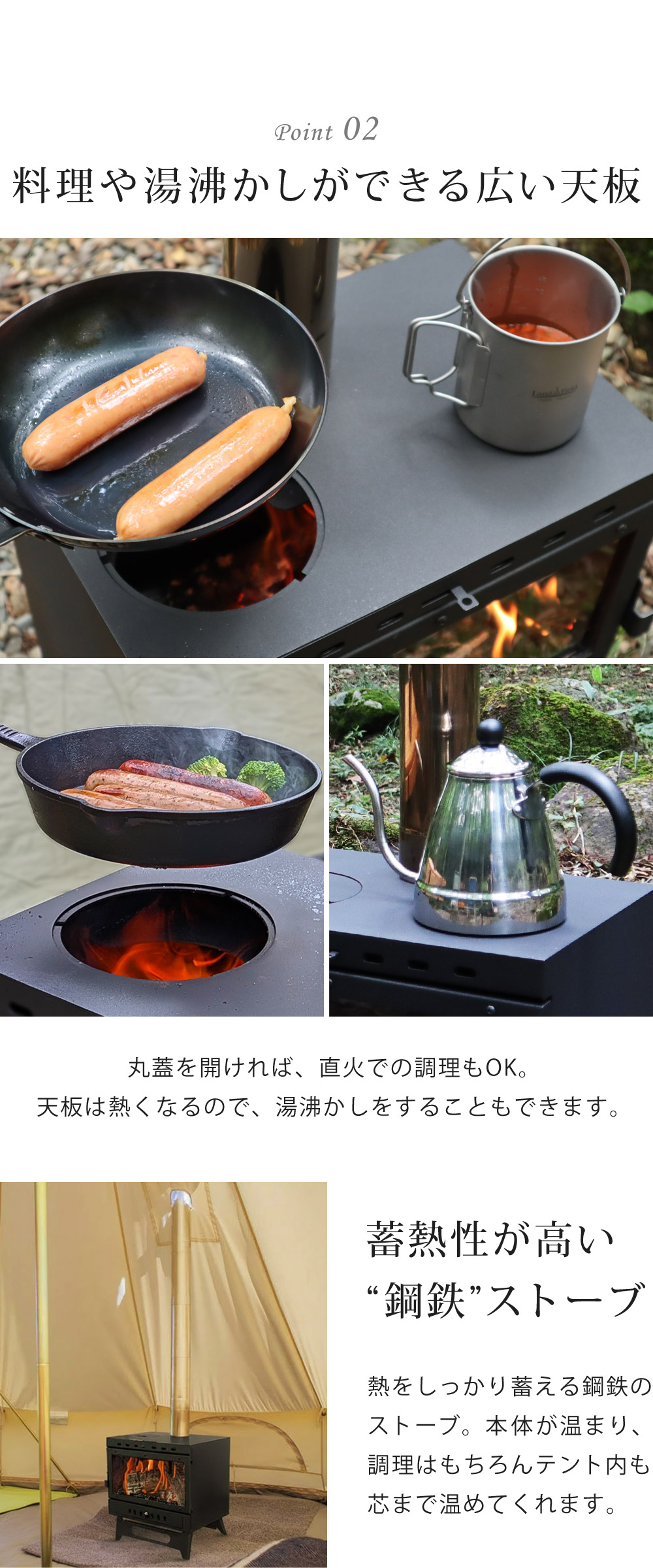 丸蓋を開けることで直火の調理も可能!