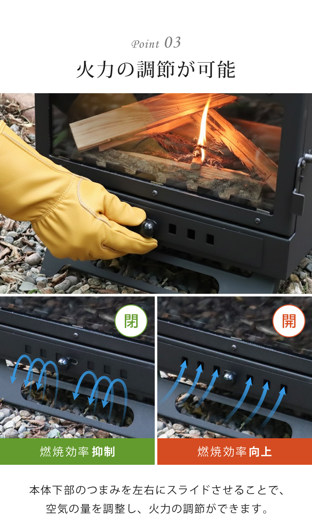上部のノブをスライドさせて空気を取り込むことにより、煙が煙突を通りやすくなり、煙たさが軽減されます。