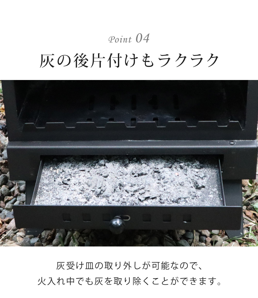 下部にセットした灰受けで、燃えた灰を落とさず受け取れるので、引火を防ぎ、汚さずに薪等を燃やすことができます。