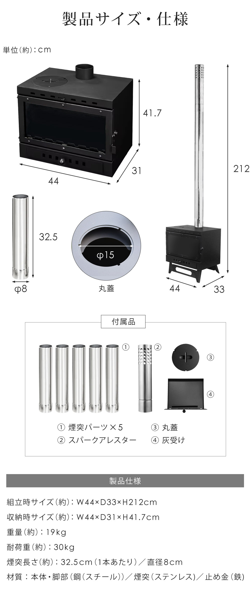 本体:鋼(スチール)/煙突:ステンレス/脚部:鋼(スチール)/止め金:鉄