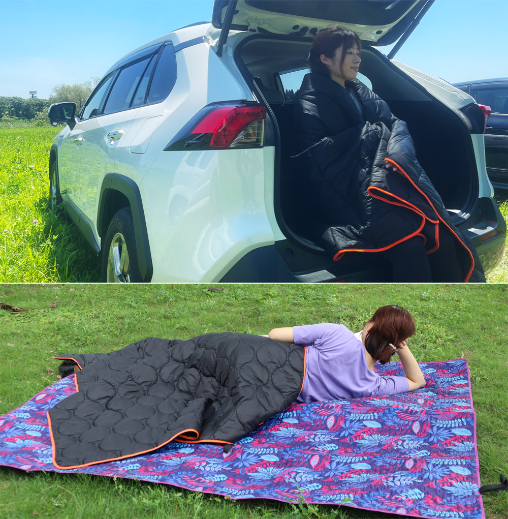 通常のアウトドアから、車中泊キャンプ、もちろん室内でも活躍できるので、災害時等でも寒さから守ってくれます。
