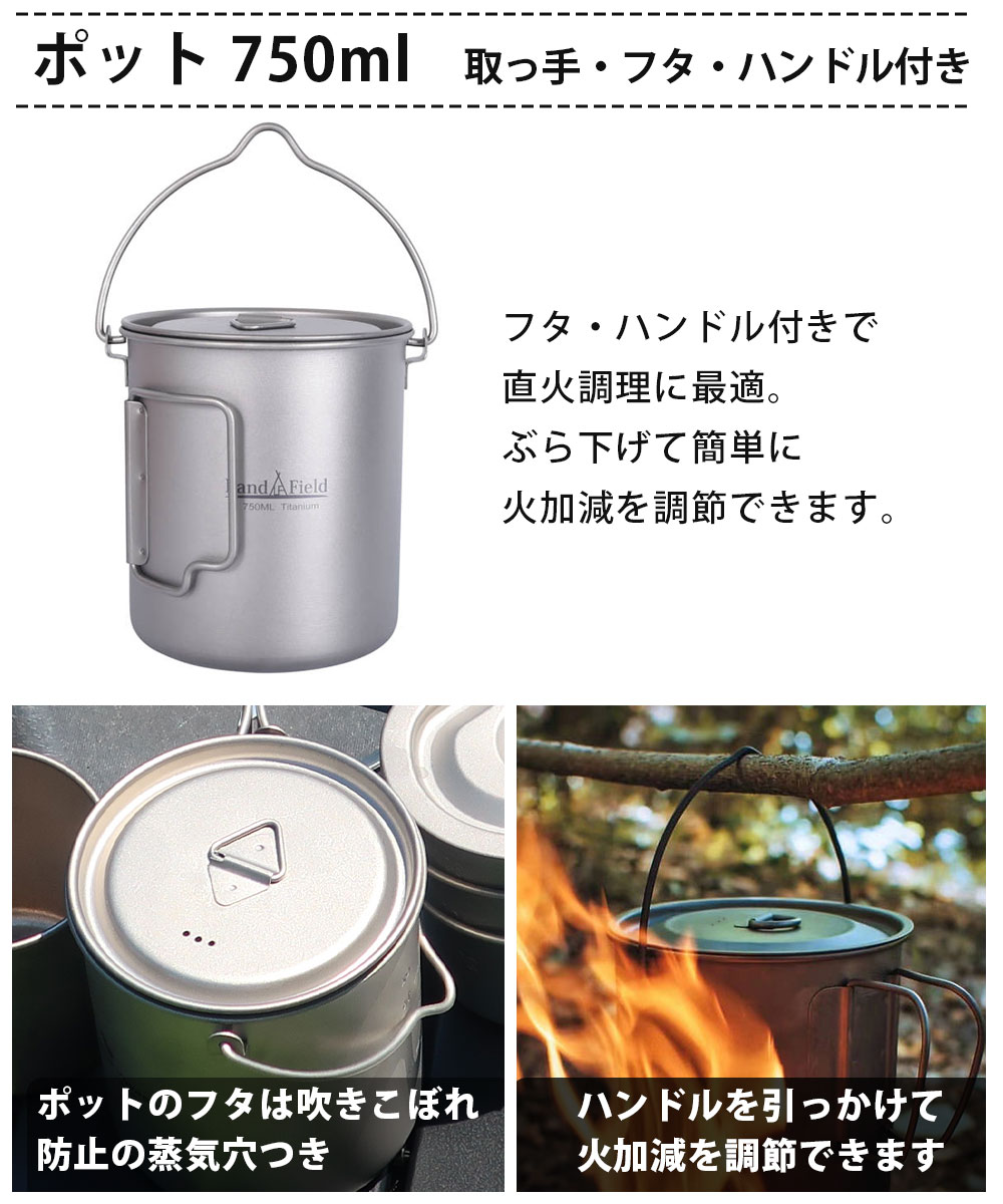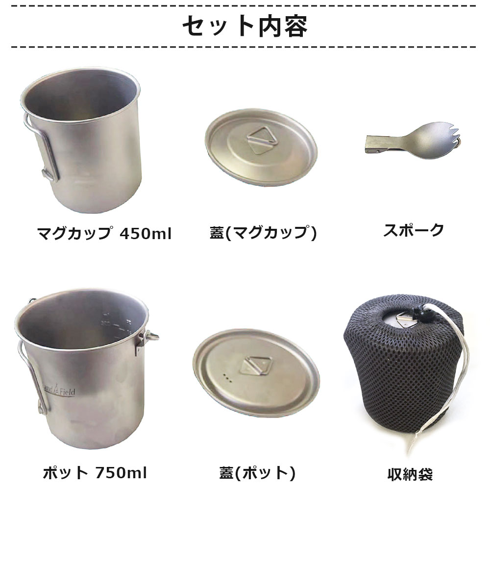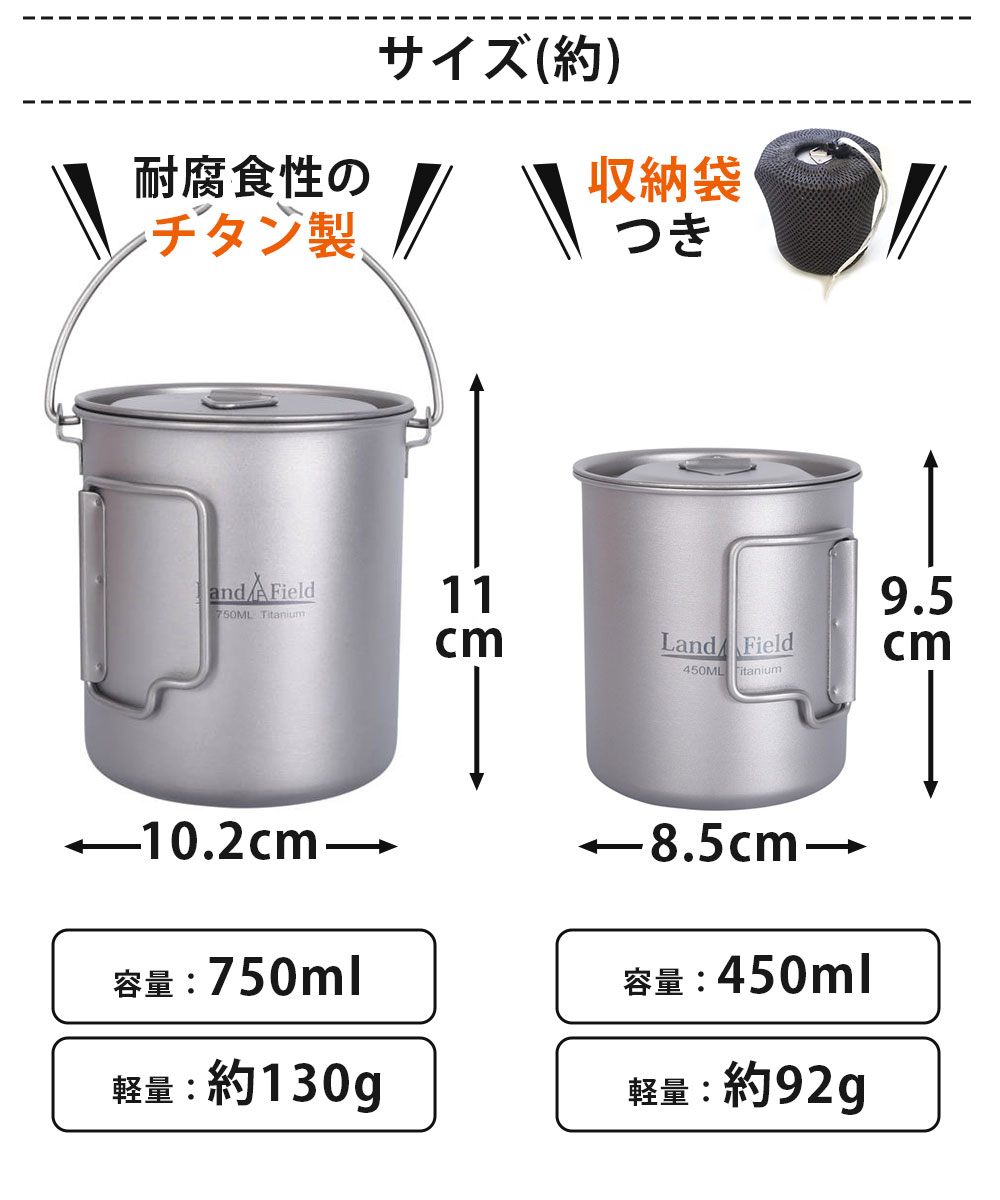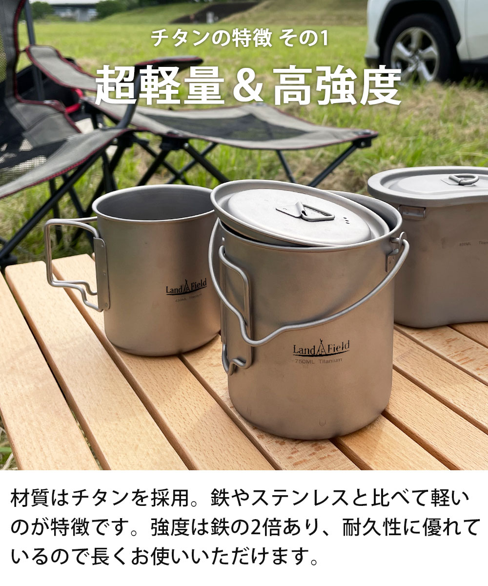 ポット スポーク マグカップ 3点セット チタン製 750ml 450ml クッカーセット 保温 保冷 耐食性 高強度 軽量 高品質 フタ付き ハンドル付き キャンプ アウトドア 食器 カップ クッカー セット Landfield