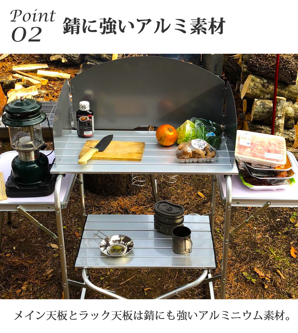 メイン天板とラック天板は錆にも強いアルミニウム素材を使用しているので耐食性に優れています。