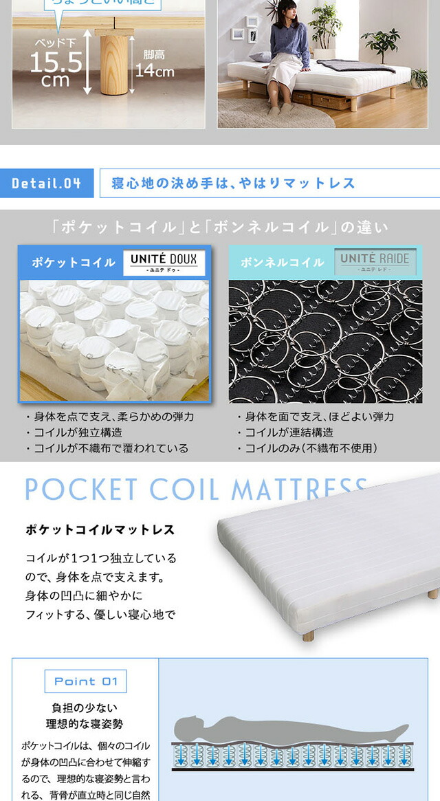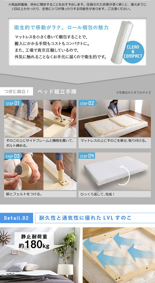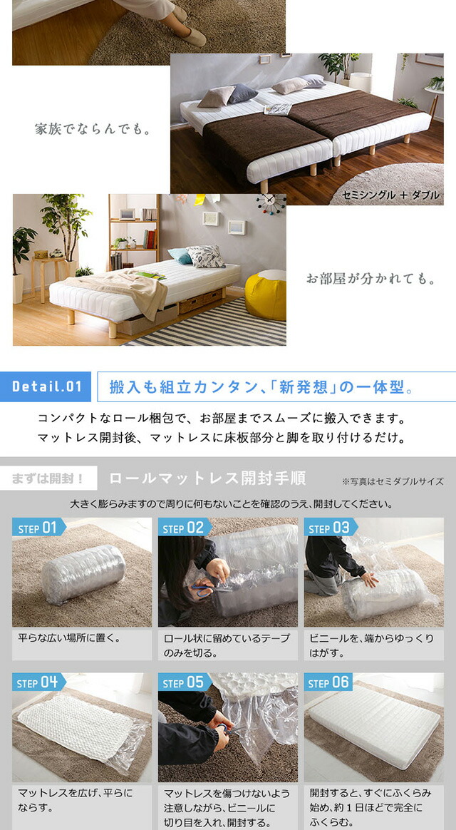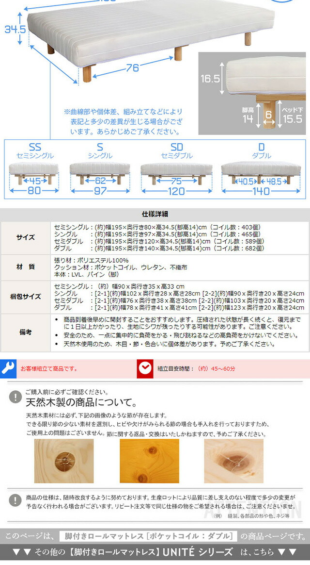新発想で搬入も組立カンタン!やわらかな寝心地 脚付きロールマットレス(ポケットコイルスプリング)Unite -Doux- -ユニテ・ドゥ- ダブルサイズ 組説簡単 ロールマットレス ベッドセット マットレスセット 代引/同梱不可[ホワイト]