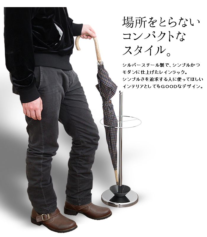 シルバースチール製で、シンプルかつモダンに仕上たレインラック。