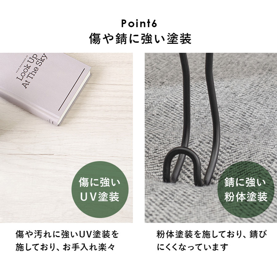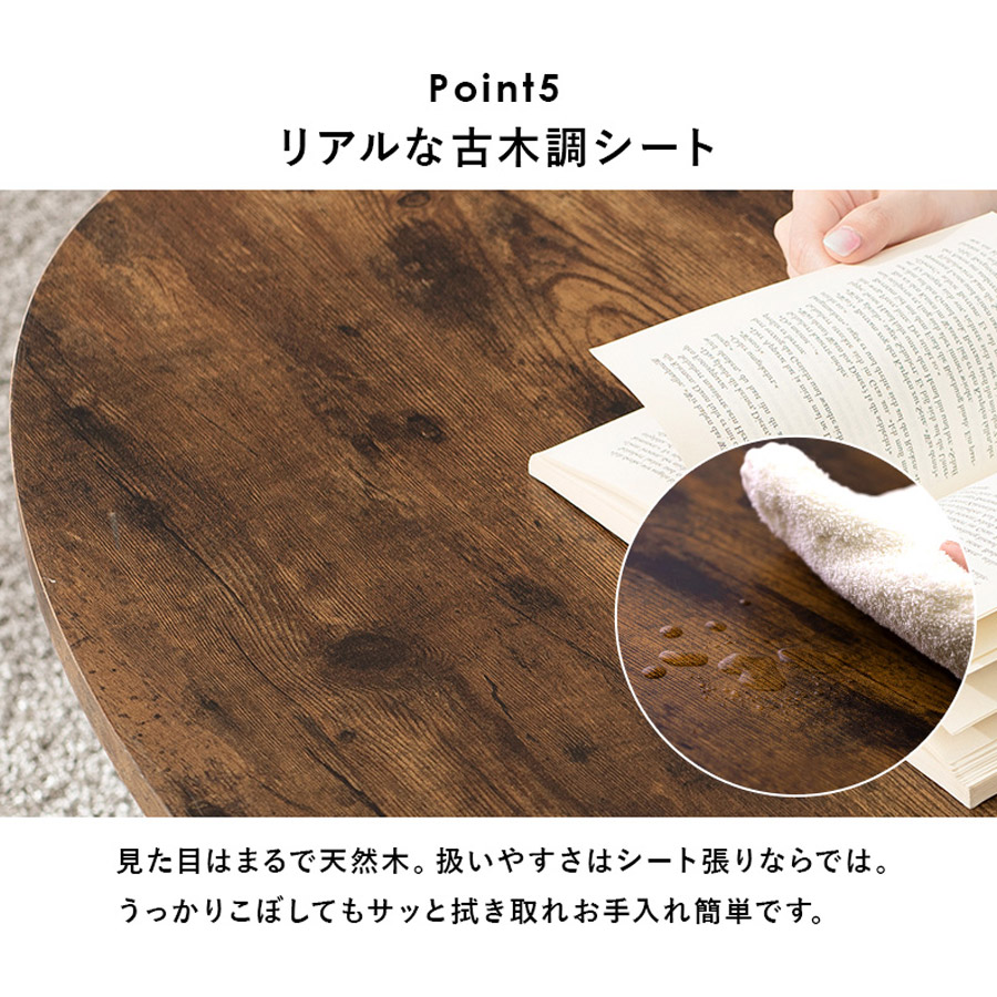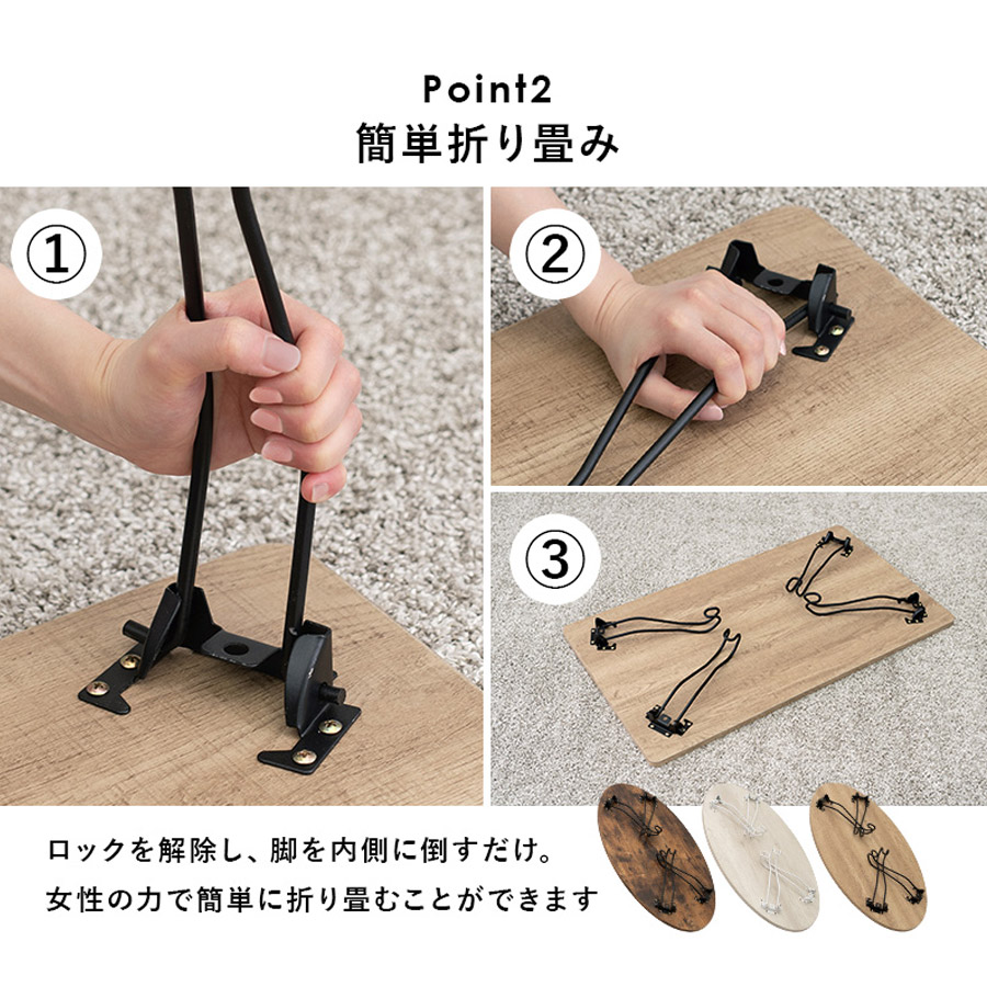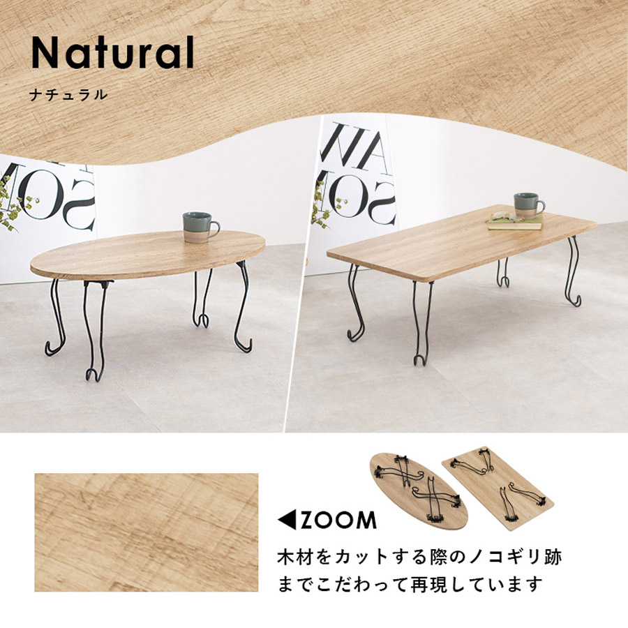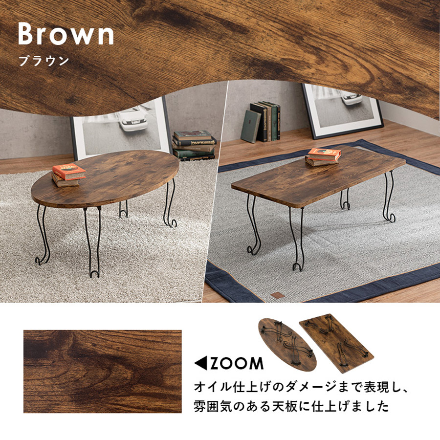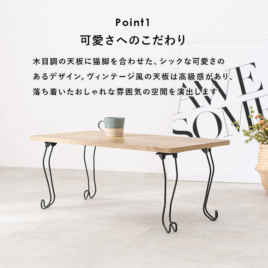 古木風の木目を再現した天板にアイアンの猫脚を合わせた、シックな可愛さのあるデザイン。折りたたみ式なのでコンパクトに収納可能