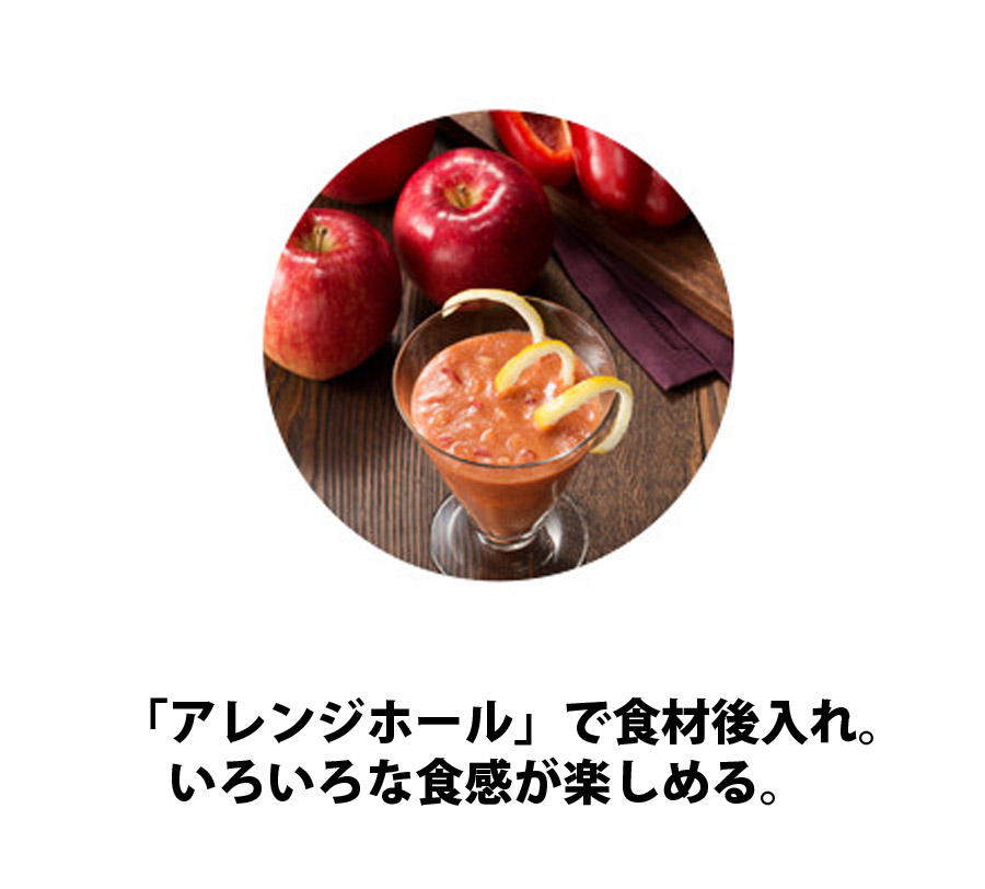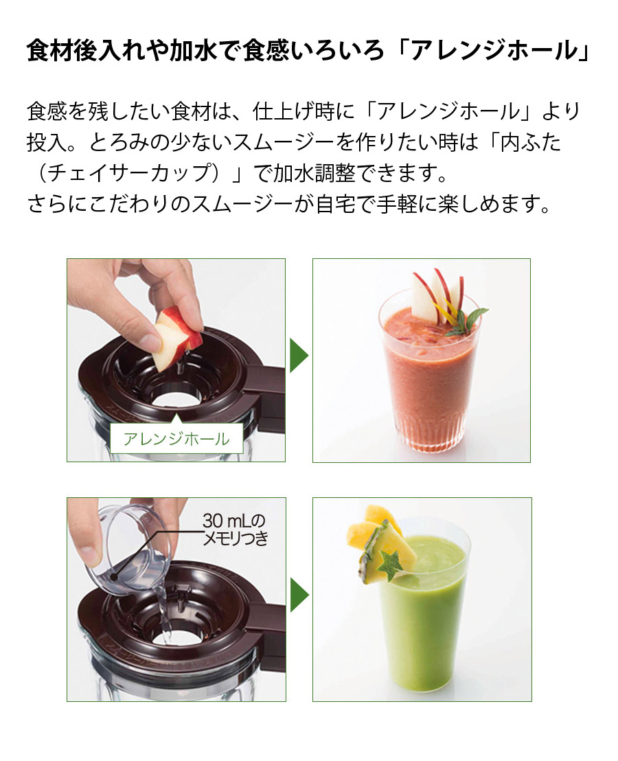 食感を残したい食材は、仕上げ時に「アレンジホール」より投入。とろみの少ないスムージーを作りたい時は「内ふた(チェイサーカップ)」で加水の微調整ができます。さらにこだわりのスムージーが自宅で手軽に楽しめます。