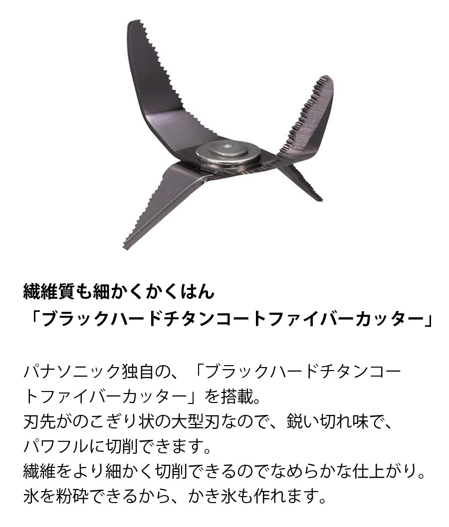 パナソニック独自の、「ブラックハードチタンコート ファイバーカッター」を搭載。刃先がのこぎり状の大型刃なので、鋭い切れ味で、パワフルに切削できます。繊維をより細かく切削できるのでなめらかな仕上がり。氷※を粉砕できるから、かき氷も作れます。
