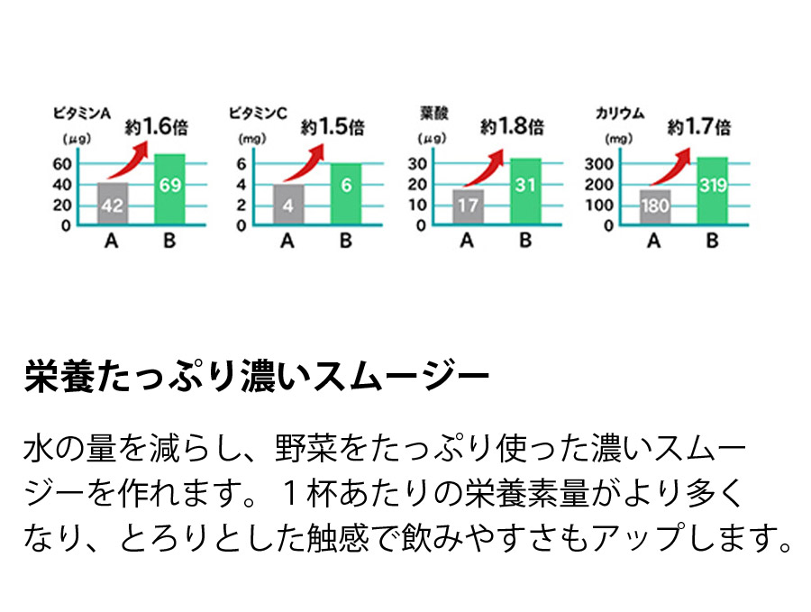 水の量を減らし、野菜をたっぷり使った濃いスムージーを作れます。1杯あたりの栄養素量がより多くなり、とろりとした食感で飲みやすさもアップします。