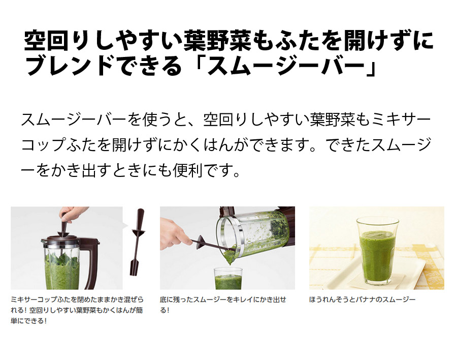 スムージーバーを使うと、空回りしやすい葉野菜もミキサーコップふたを開けずにかくはんができます。できたスムージーをかき出すときにも便利です。