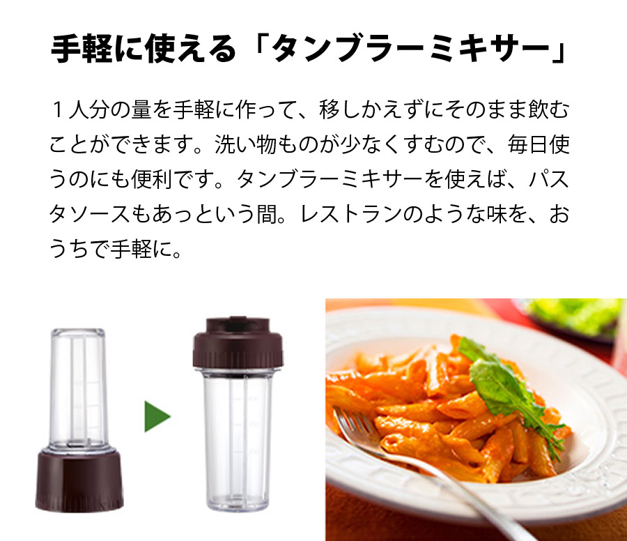 1人分の量を手軽に作って、移しかえずにそのまま飲むことができます。 洗いものが少なくすむので、毎日使うのにも便利です。タンブラーミキサーを使えば、パスタソースもあっという間。レストランのような味を、おうちで手軽に。