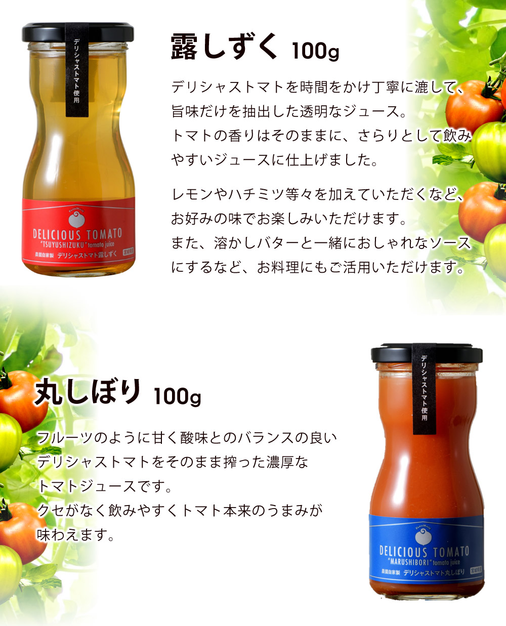 フルーツのように甘く酸味とのバランスの良い「デリシャストマト」をそのまま搾った濃厚なトマトジュースです。