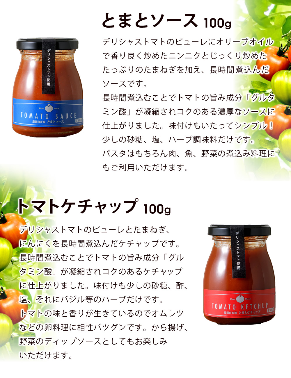 デリシャスファームの手作りトマト加工品は一切の化学合成食品添加物を使わずに仕上げたこだわり商品。