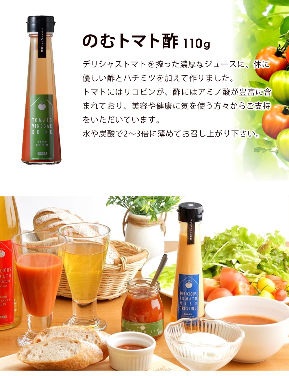 トマトにはリコピンが、酢にはアミノ酸が豊富に含まれており、美容や健康に気を使う方々からご支持をいただいています。