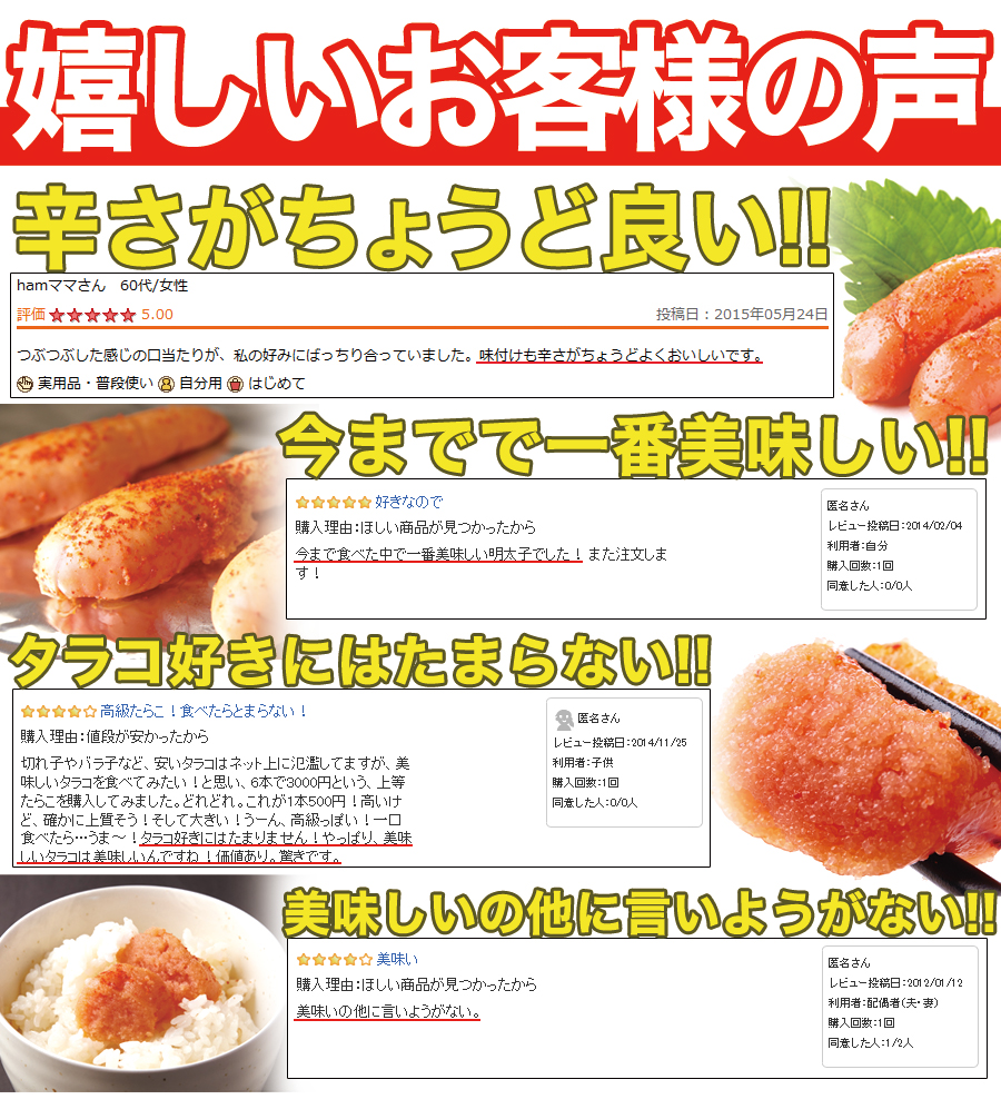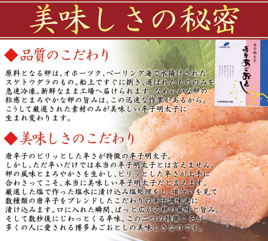 ■原材料名:すけどうだらの卵(ロシア又はアメリカ)、はっ酵調味料、食塩、デキストリン、唐辛子、たん白加水分解物、酵母エキス、調味料(アミノ酸等)、甘味料(ソルビトール)、酸化防止剤(ビタミンC)、ナイアシン、発色剤(亜硝酸Na)、(原材料の一部に、大豆、ゼラチンを含む)