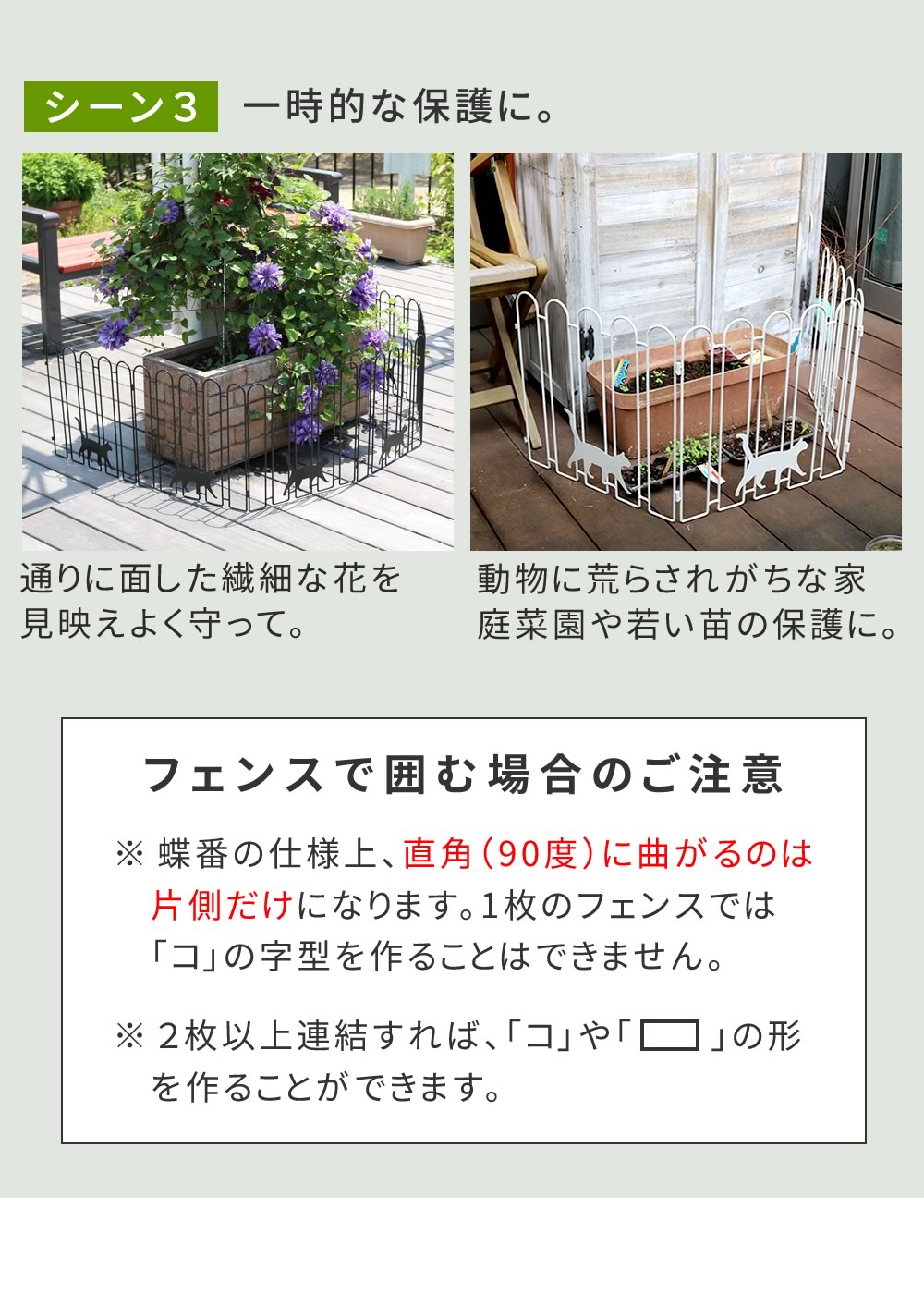 ※蝶番の仕様上、直角(90度)に曲がるのは片側だけになります。1枚のフェンスでは「コ」の字型にはできません。