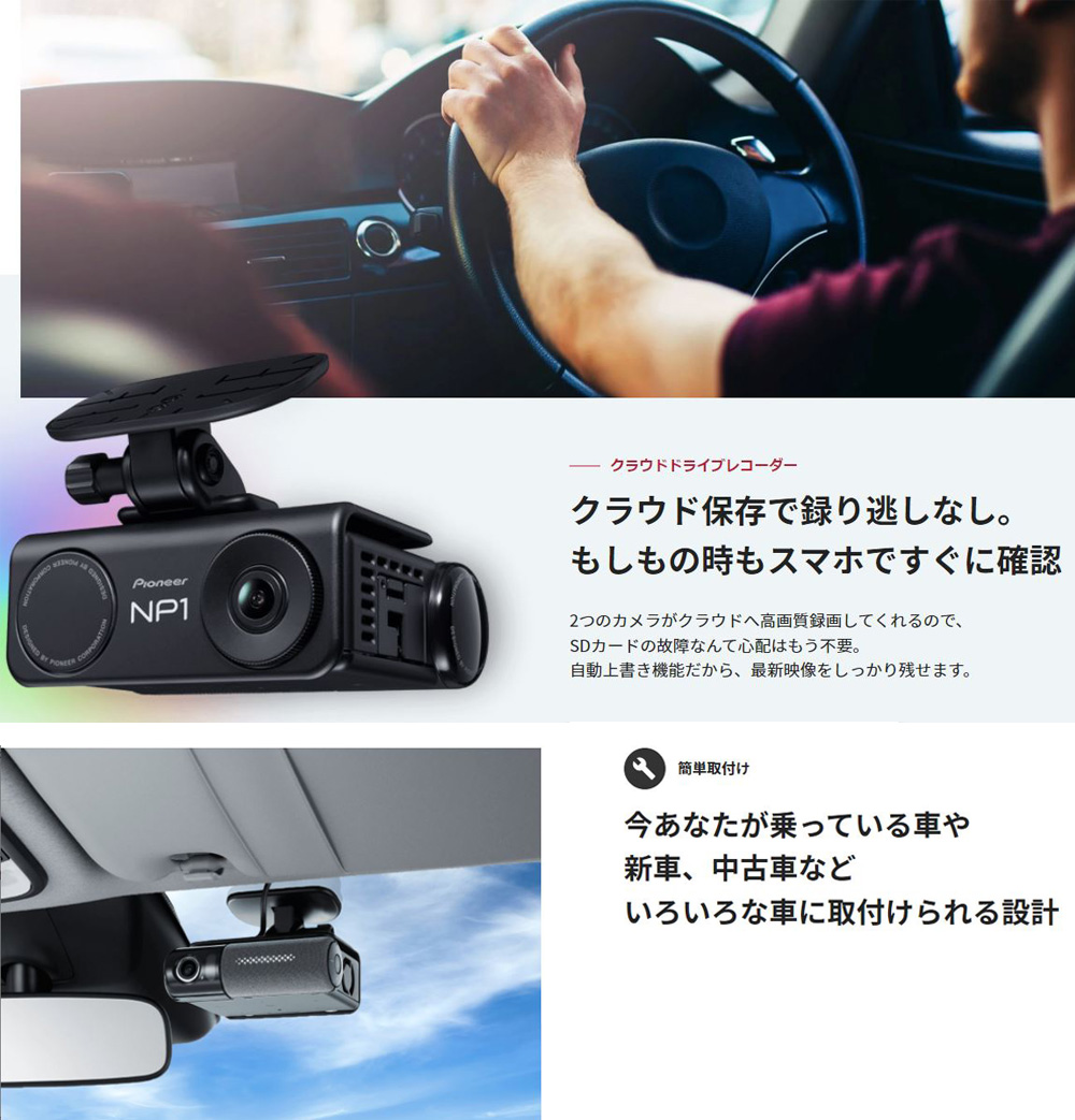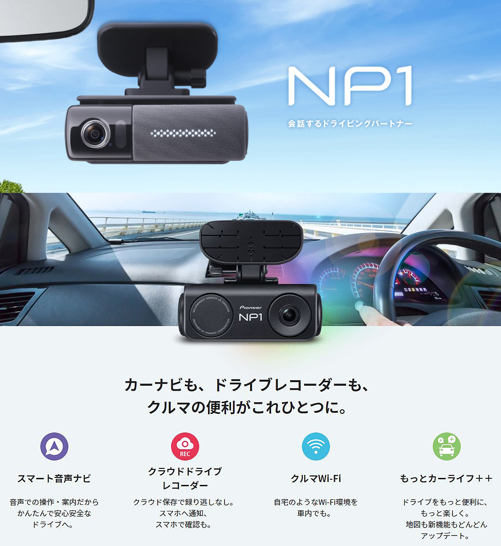 ドライブレコーダー カーナビ NP1 パイオニア PIONEER NP-001 ドライビングパートナー スマート音声ナビ クラウドドライブレコーダー Wi-Fi オールインワン車載器 駐車監視 スマホ通知 バックカメラ 前後 【代引不可】【同梱不可】