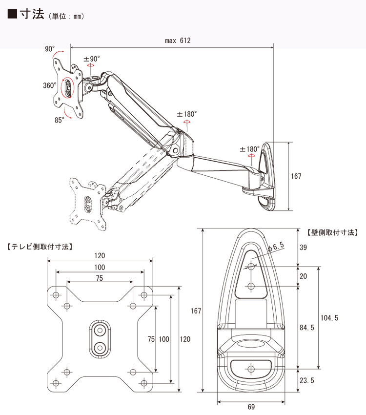 上下:+85°/ -90° 左右:180°アーム部各関節:360°