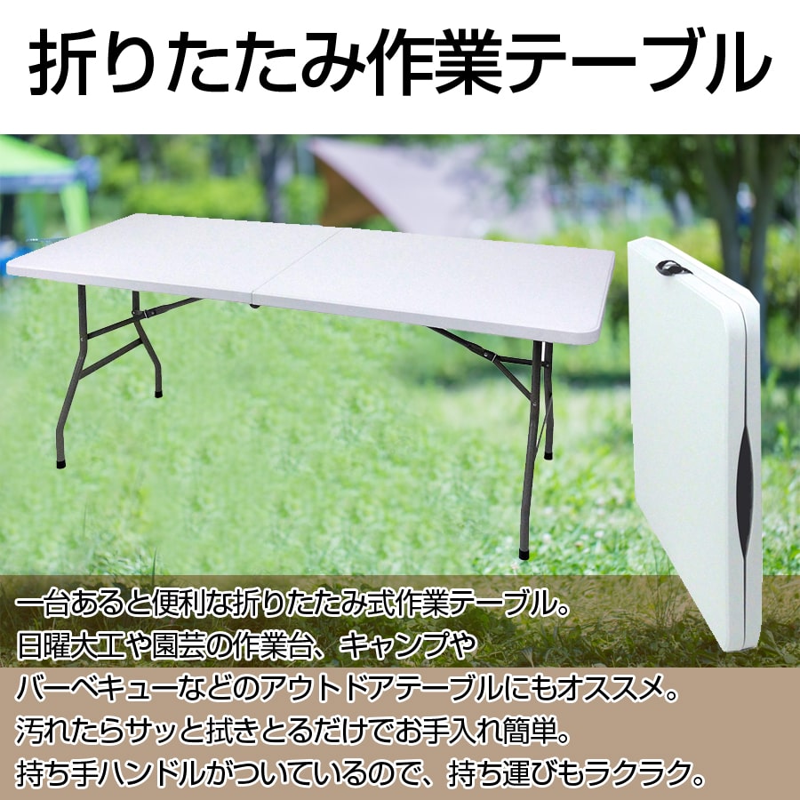 検索キーワード:折りたたみ式 作業テーブル 日曜大工 園芸 S字フック付 作業台 キャンプ バーベキュー アウトドアテーブル お手入れ簡単 持ち手ハンドル 持ち運び ラクラク 汚れ 拭き取り ハンドル 折り畳み式 作業用