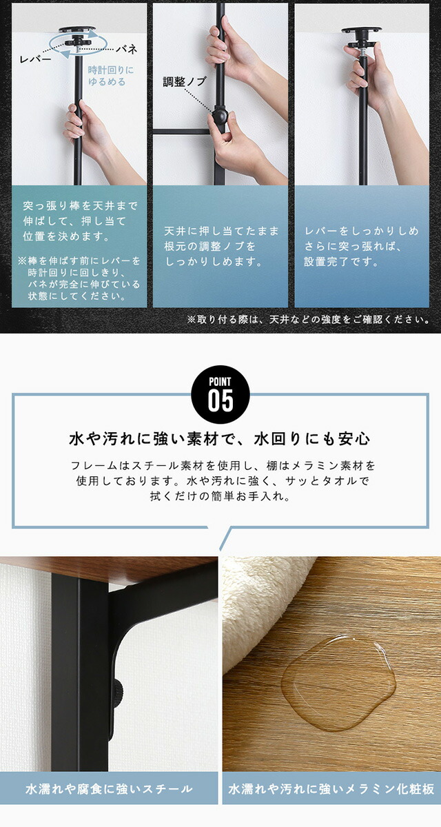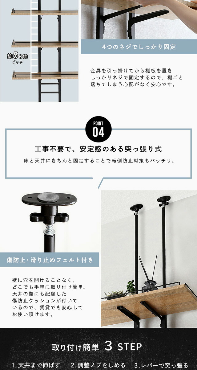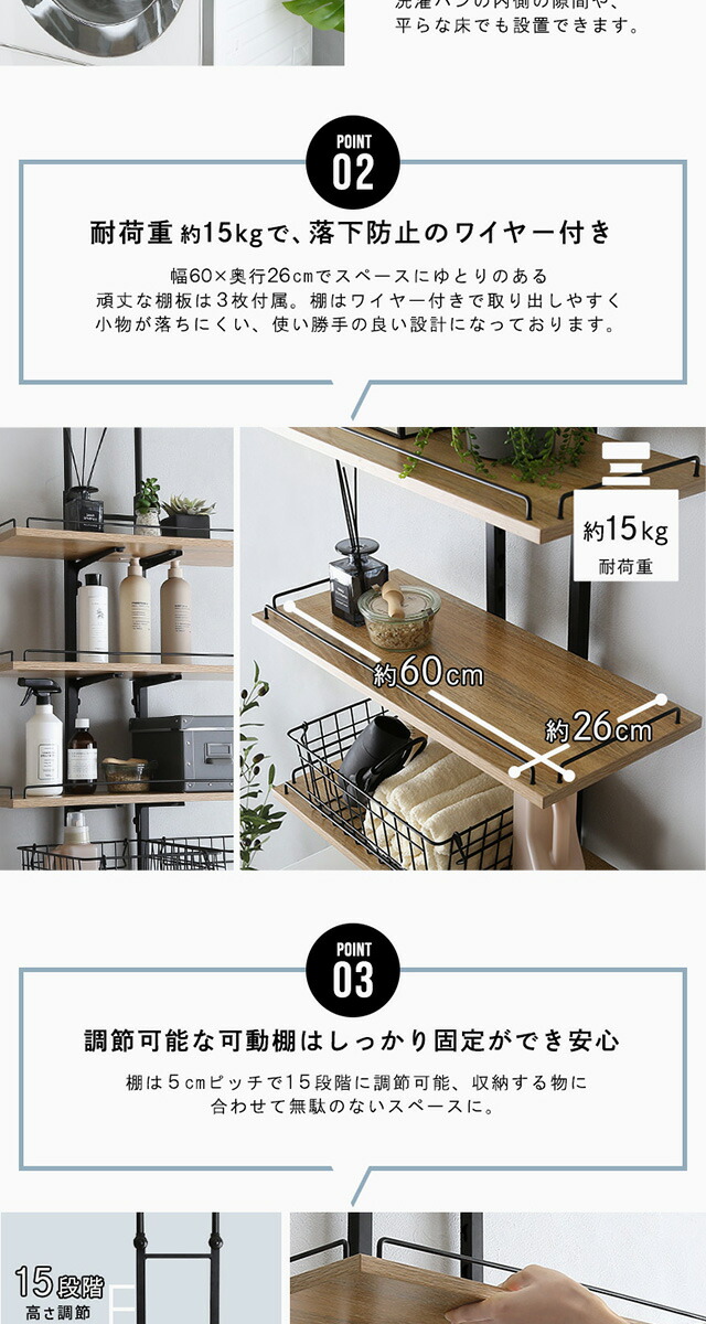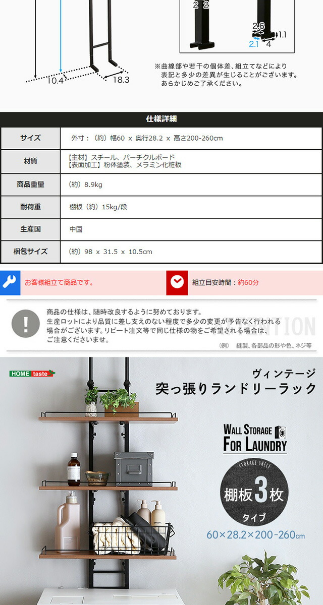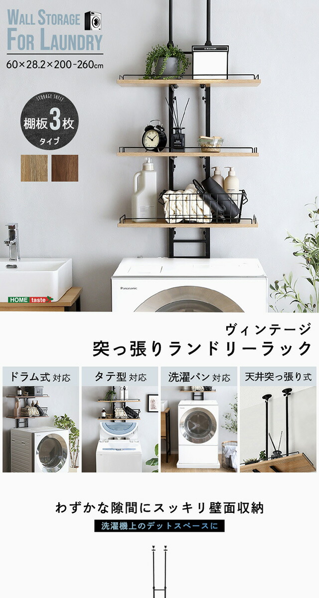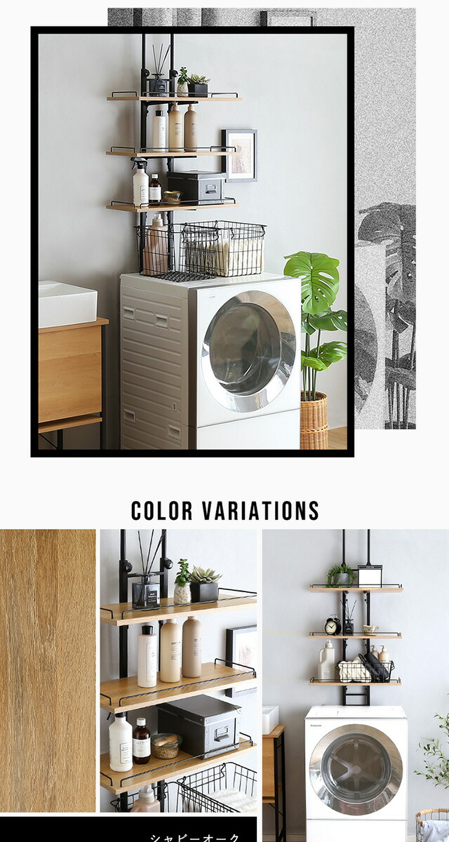 ランドリーラック 突っ張り スリム 幅60 棚板 3段 伸縮 高さ調節 落下防止ワイヤー付き ヴィンテージ 洗濯機ラック 洗濯機上ラック 収納 収納棚 突っ張り式 つっぱり 木目調 洗面所 隙間収納 壁面収納 新生活 一人暮らし 【代引不可】[シャビーオーク]