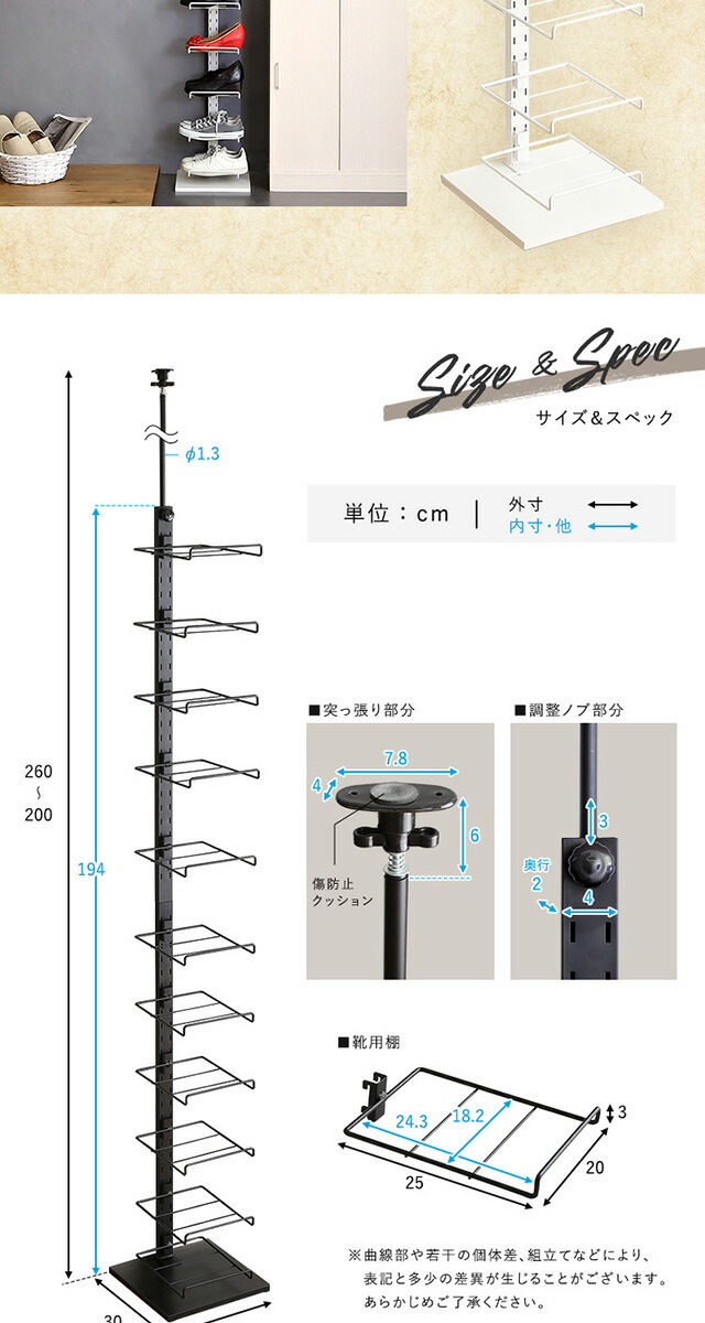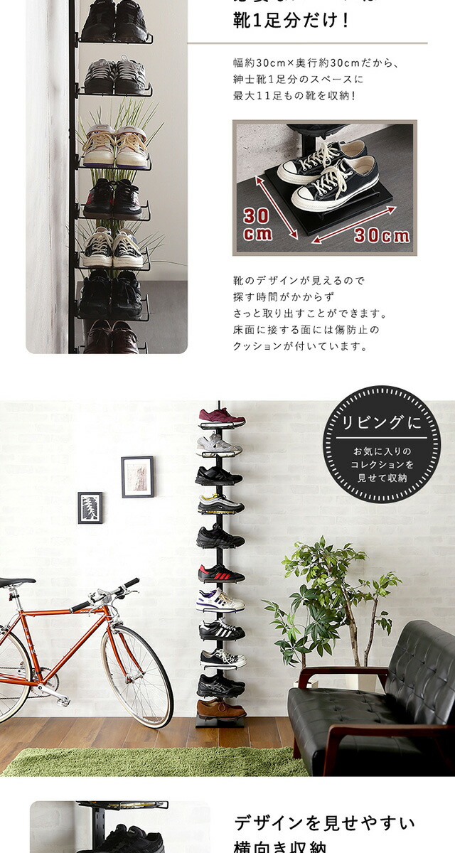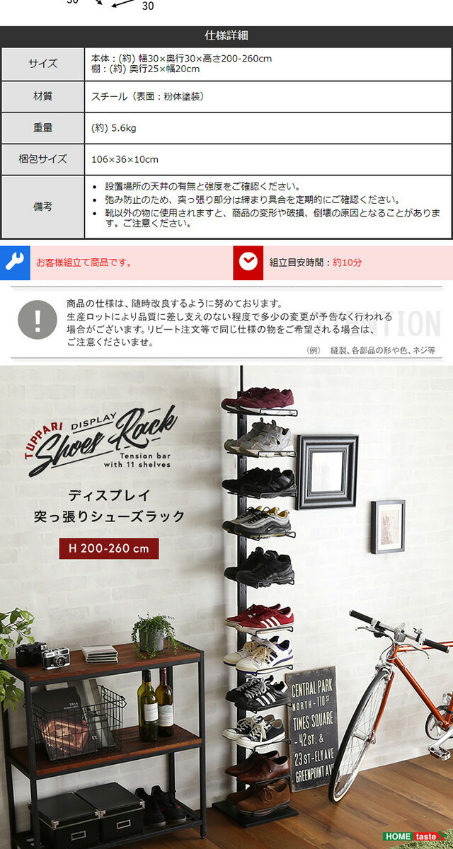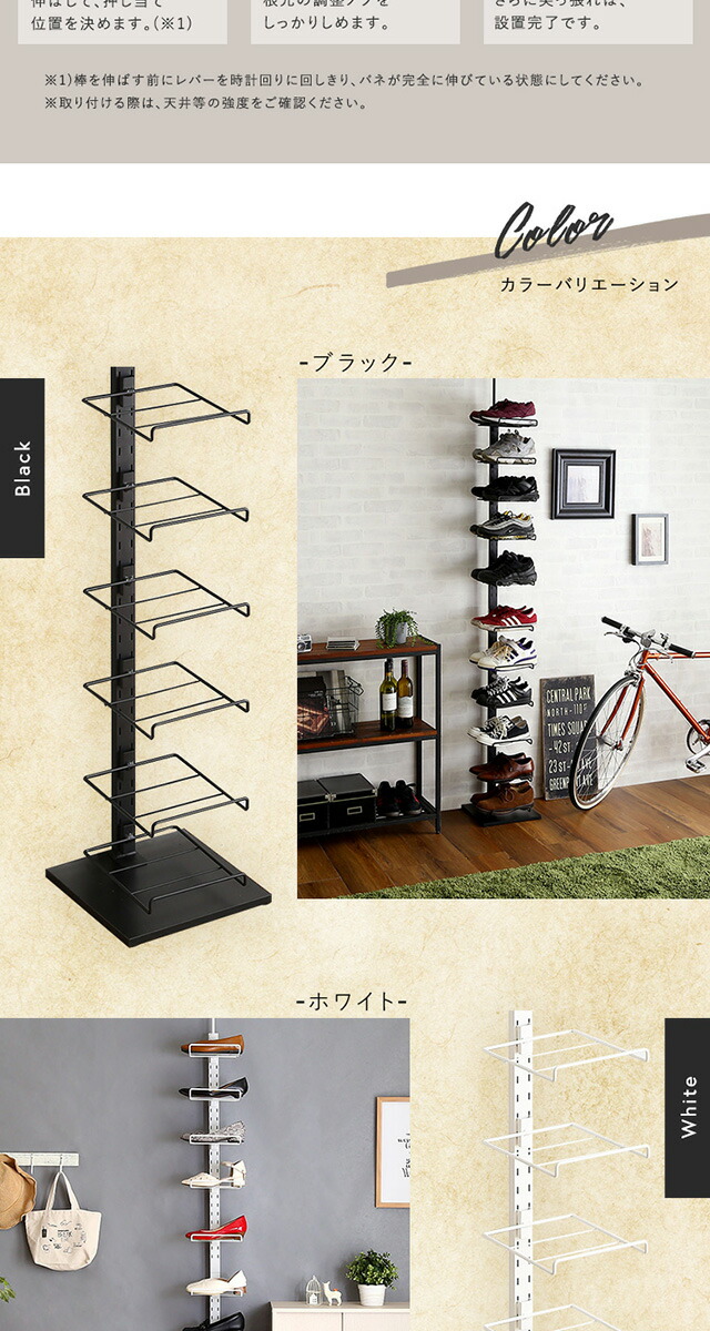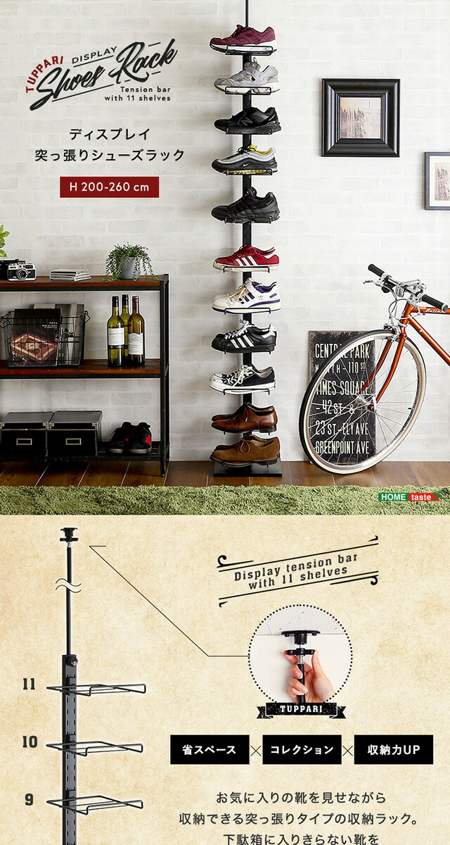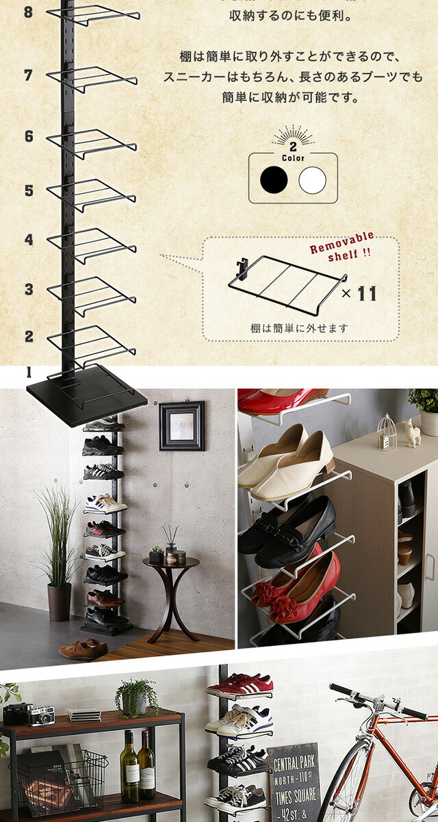 シューズラック 突っ張り ディスプレイラック 11段 スリム 伸縮 高さ調節 省スペース 靴箱 下駄箱 靴入れ つっぱり 突っ張りシューズラック 玄関 靴収納 【代引不可】[ホワイト]