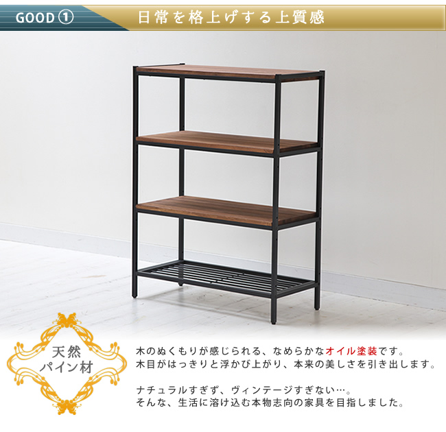 天然木製シェルフ4段 簡単組立 4段 アンティーク モダン ナチュラル オイル ミッドセンチュリー ウッド スタイリッシュ シンプル シェルフ ラック ハンガー インテリア 家具 天然 おしゃれ カフェ 北欧 木目 【代引不可】