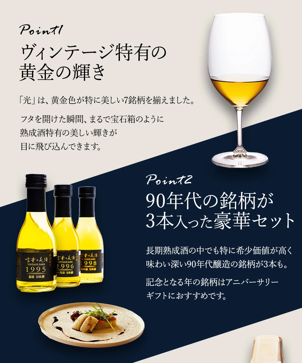 検索キーワード: 高級 特別純米 大吟醸 吟醸 本醸造 純米 日本酒セット 飲み比べ ギフト 化粧箱 プレゼント 贈り物 酒 お酒 古酒 熟成酒 贈答品 ヴィンテージ お歳暮 御歳暮 父の日 敬老の日 誕生日 退職祝い お正月 年末年始 内祝い 記念日 お中元 御中元 古希 喜寿 傘寿 米寿 卒寿 白寿 百