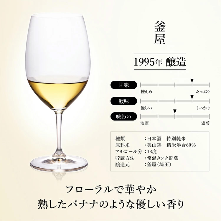 吟醸の熟成古酒。すっきりとした酸が最初に立ち上がるのが特長で、バターの芳醇な香りとバナナの甘い香りも感じられとても華やかで、