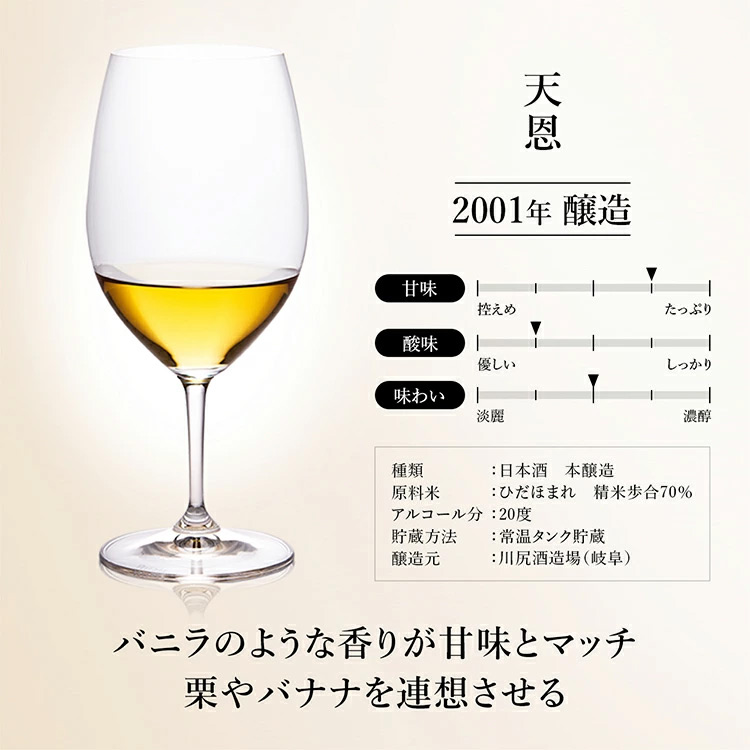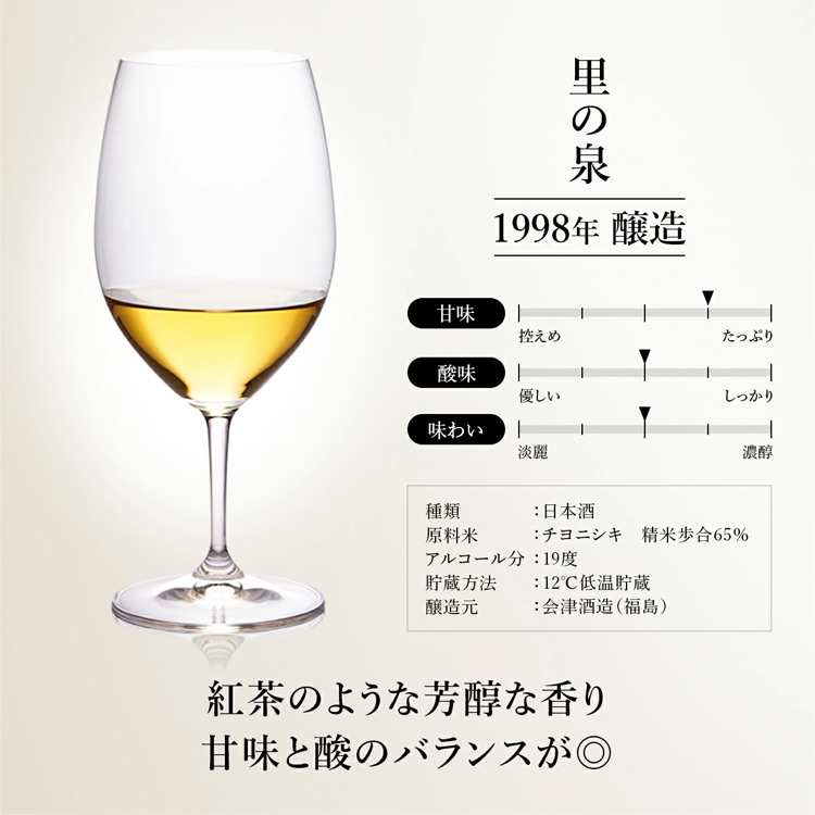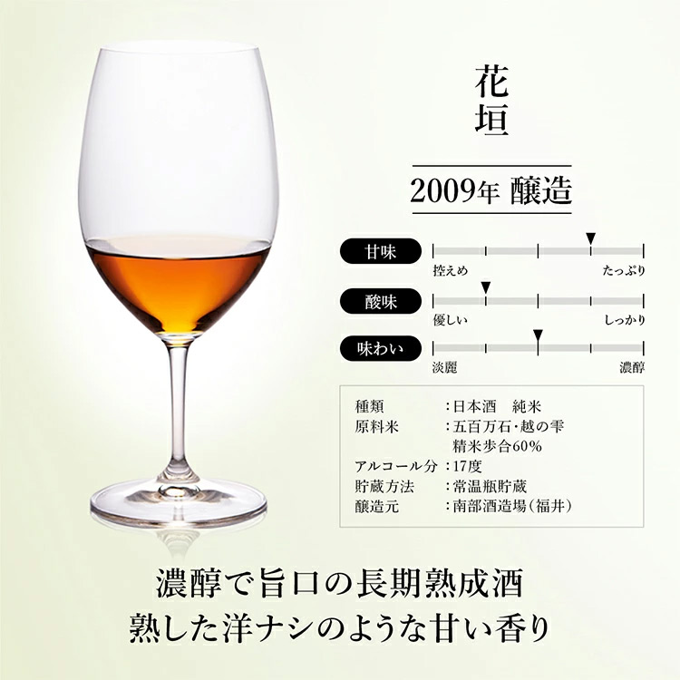 ふくよかな甘味としっかりとした酸のバランスが良い熟成酒。余韻も長く、甘く香ばしい香りが心地よいです。