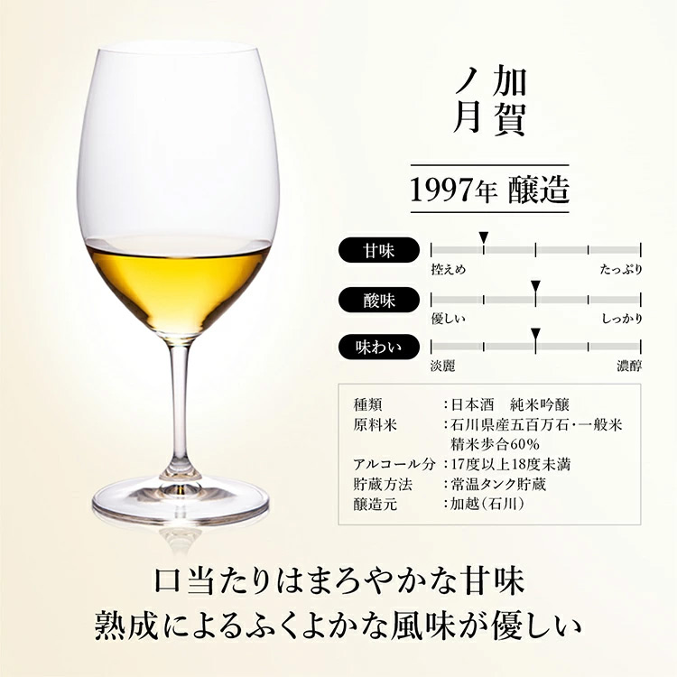 濃醇に仕上がる伝統的な手造り製法を用いた純米吟醸を熟成させました。口当たりはまろやかな甘味が広がり、熟成によるふくよかな風味が優しく、ほどよい酸がベールのように包み込みバランスがとても良いです。