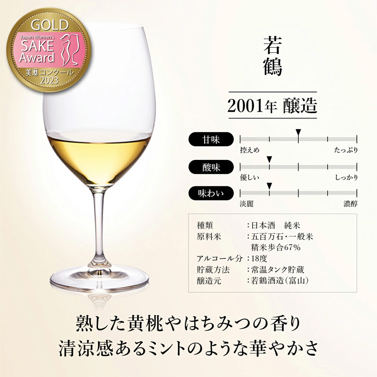 醸造元 若鶴酒造 (創業1862年 富山県砺波市) 酒造りの専門家は杜氏(とうじ)と呼ばれ、気候風土に合わせた流派が各地に存在する。代表なものに越後杜氏と南部杜氏があるが、若鶴はかつて2つの蔵でそれぞれを雇い競わせていた。今では一人の社員杜氏が両方の流派を受け継ぎ醸しているため、若鶴の個性となっている。