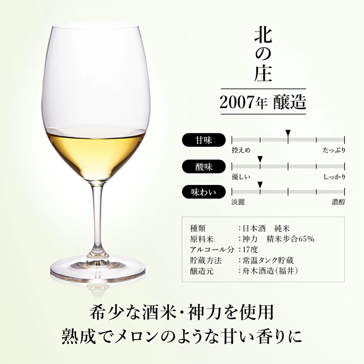 希少な酒米・神力を使い、伝統的な山廃という製法でしっかりした味の酒を醸しました。熟成により、メロンの甘い香りと白コショウのようなスパイスが感じられます。酸を柔らかい甘味が包み込む、エレガントな味わいです。