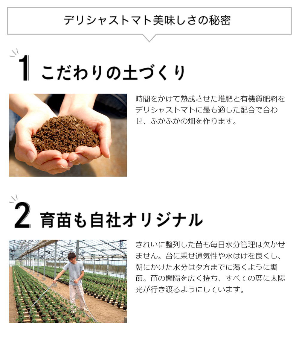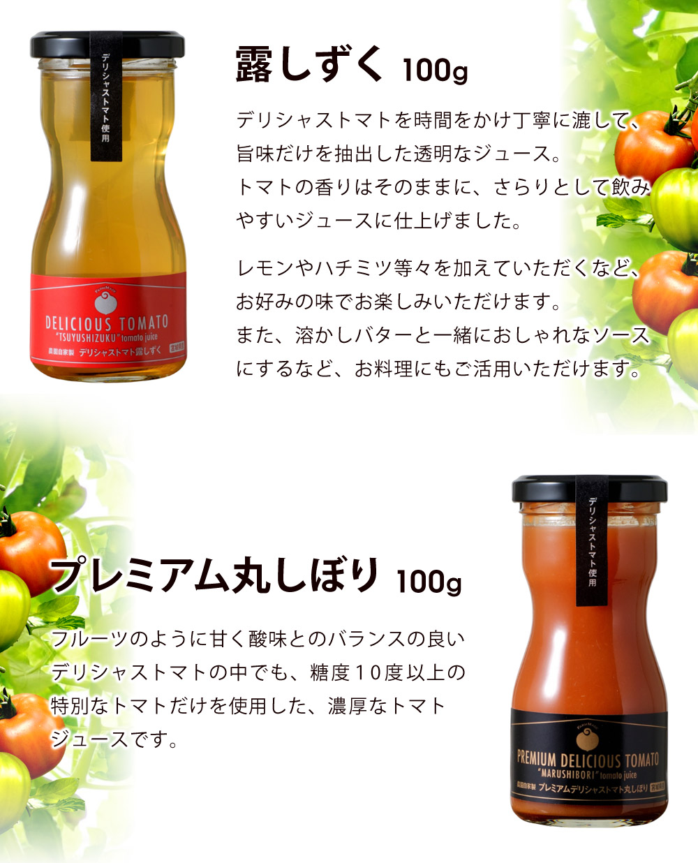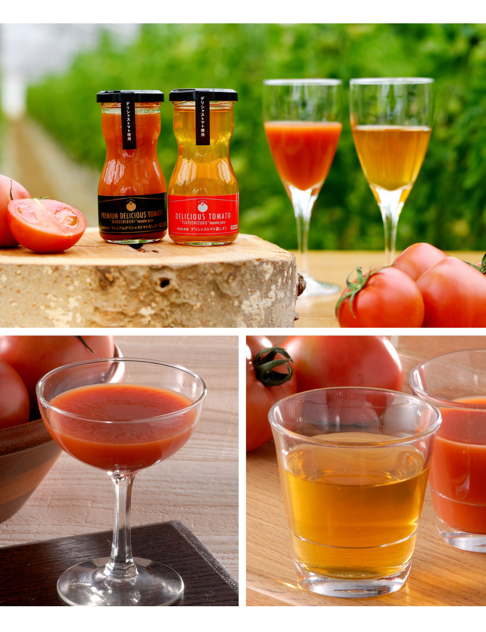 フルーツのように甘く酸味とのバランスの良い「デリシャストマト」の中でも糖度10度以上の特別なトマトだけを使用した濃厚な「プレミアム丸しぼり」と「露しずく」は時間をかけて丁寧に漉し旨味だけを抽出したトマトなのに透き通る黄金色のジュース。