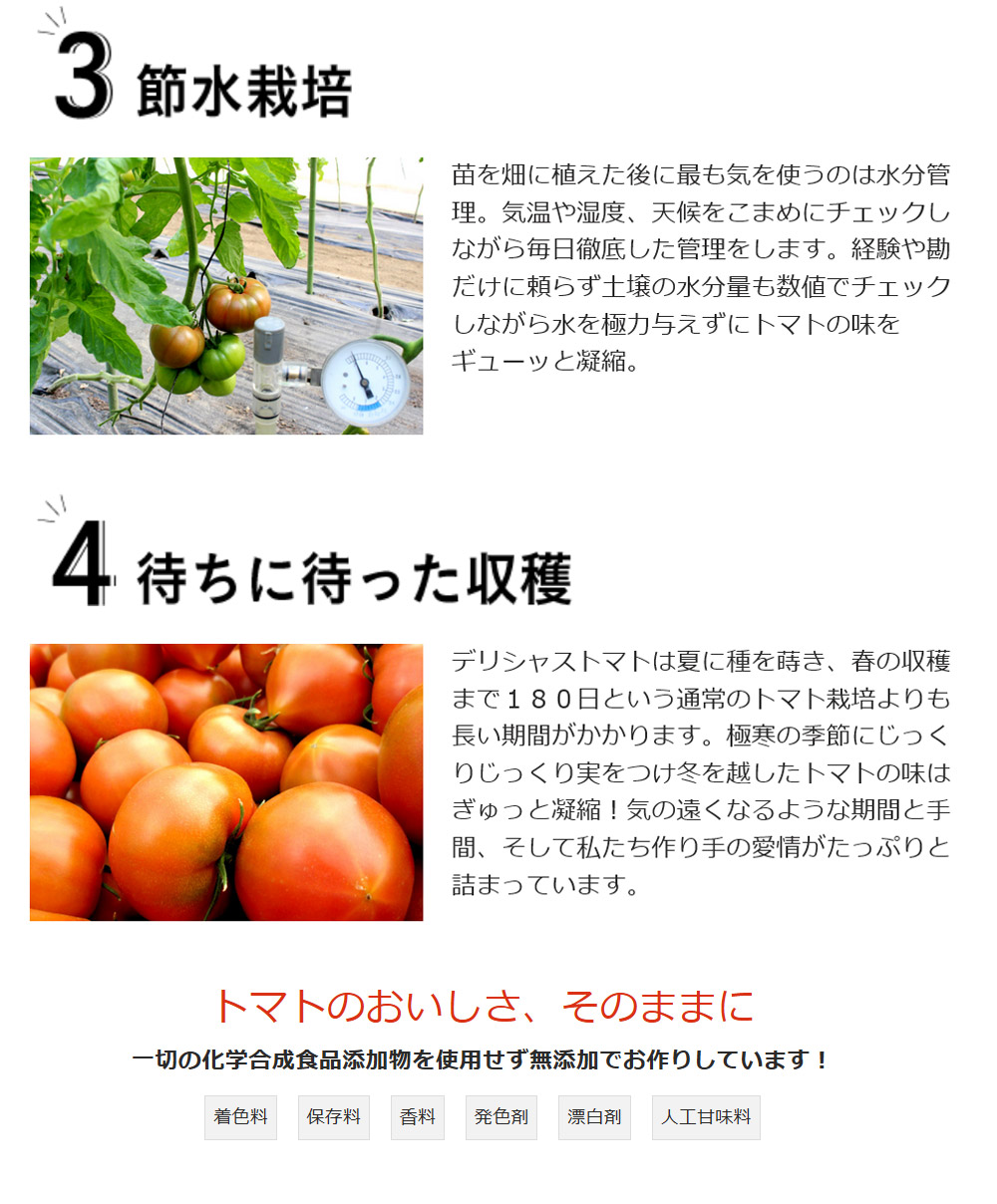 デリシャスファームの手作りトマト加工品は一切の化学合成食品添加物を使わずに仕上げたこだわり商品。