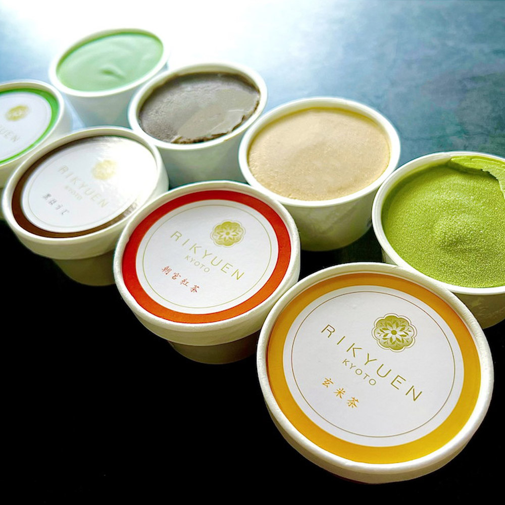 宇治抹茶アイス・黒ほうじアイス・朝宮紅茶アイス・玄米茶アイス。
