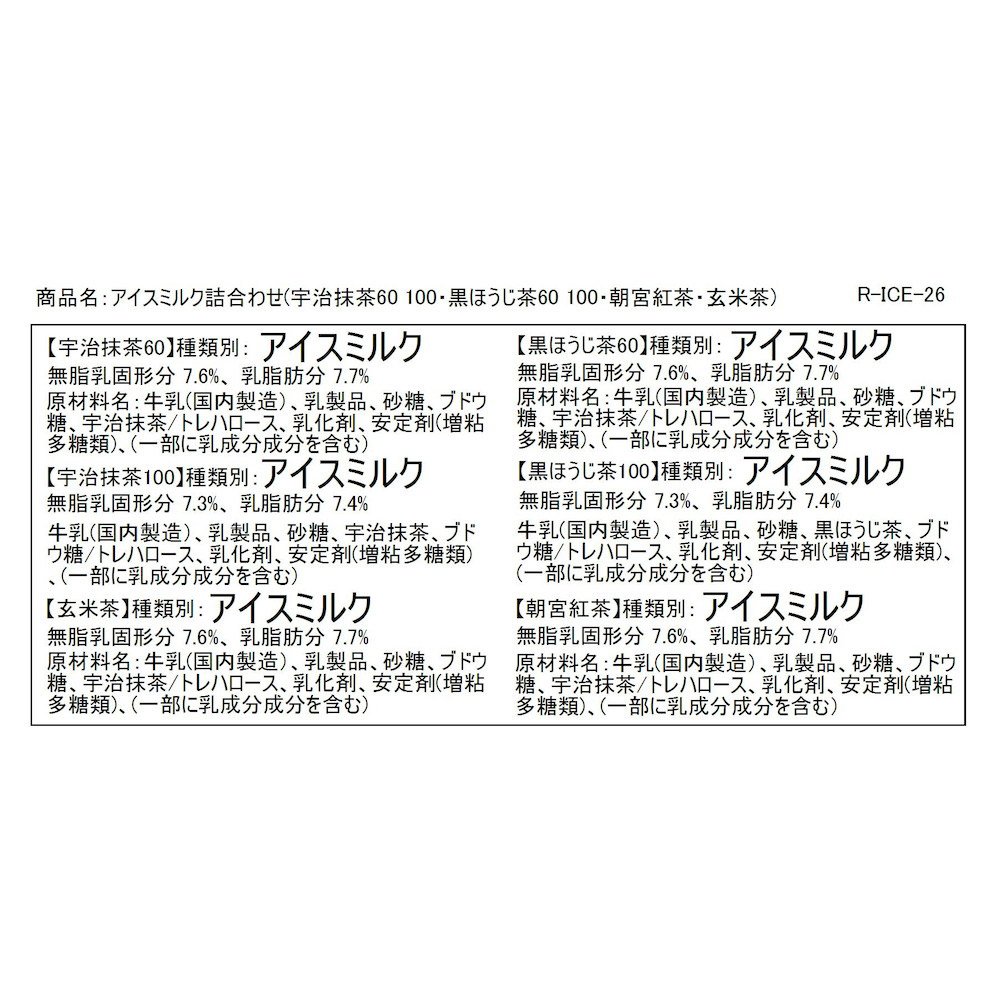 [宇治抹茶60・宇治抹茶100]無脂乳固形分 9.2%、乳脂肪分 7.2%、牛乳、砂糖、生クリーム、宇治抹茶、ブドウ糖、脱脂粉乳、乳化剤、安定剤(増粘多糖類、アルギン酸Na)、(原材料の一部に乳化剤を含む)