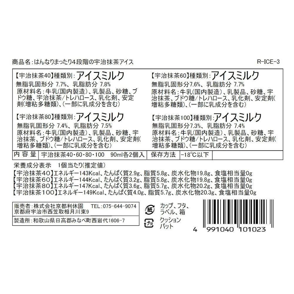 品添加物:牛乳、砂糖、生クリーム、宇治抹茶、ブドウ糖、脱脂粉乳、乳化剤、安定剤(増粘多糖類、アルギン酸Na)、(原材料の一部に乳化剤を含む)