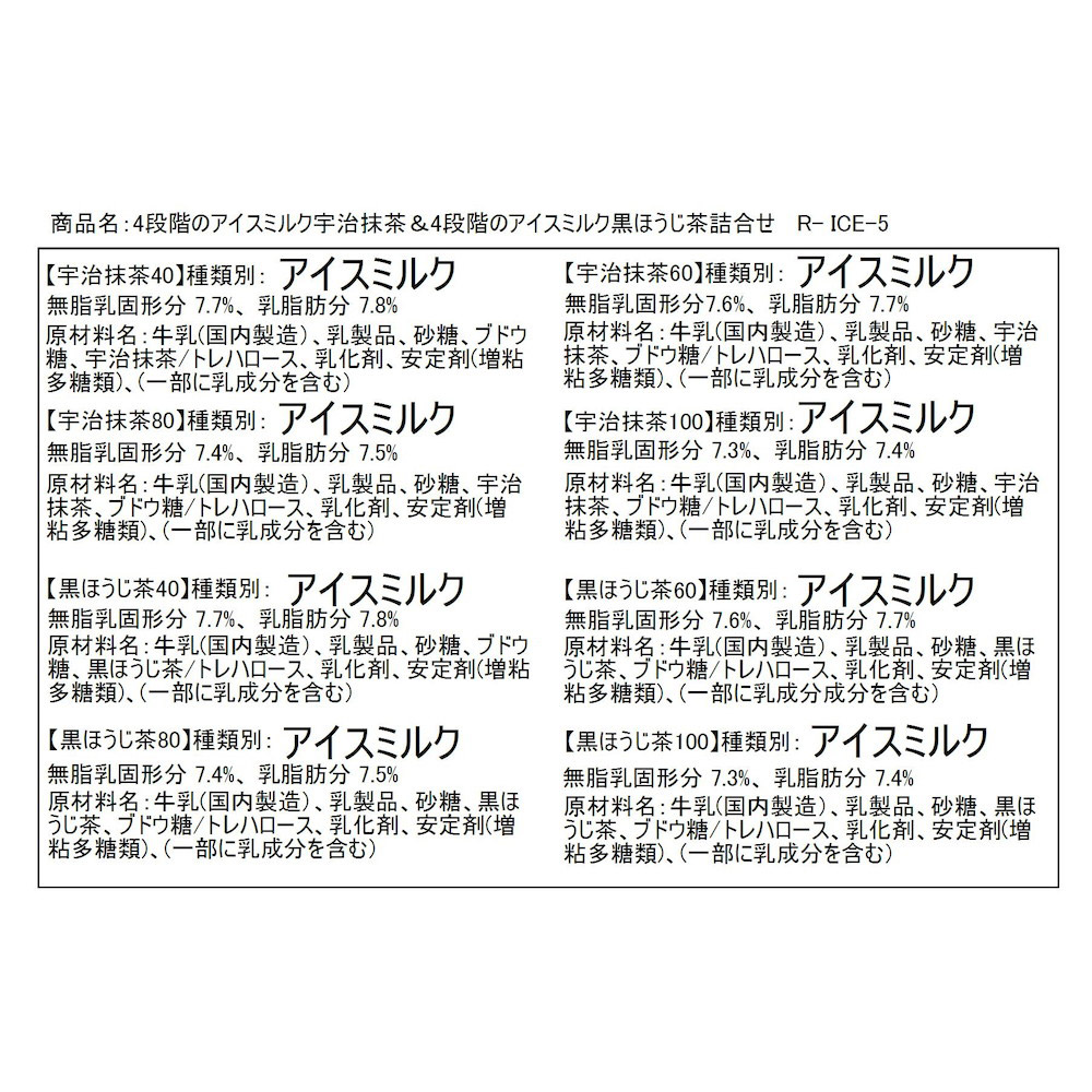 ■4段階の宇治抹茶アイス:牛乳(国内製造)、砂糖、生クリーム、宇治抹茶、ブドウ糖、脱脂粉乳、乳化剤、安定剤(増粘多糖類、アルギン酸Na)、(原材料の一部に乳化剤を含む)