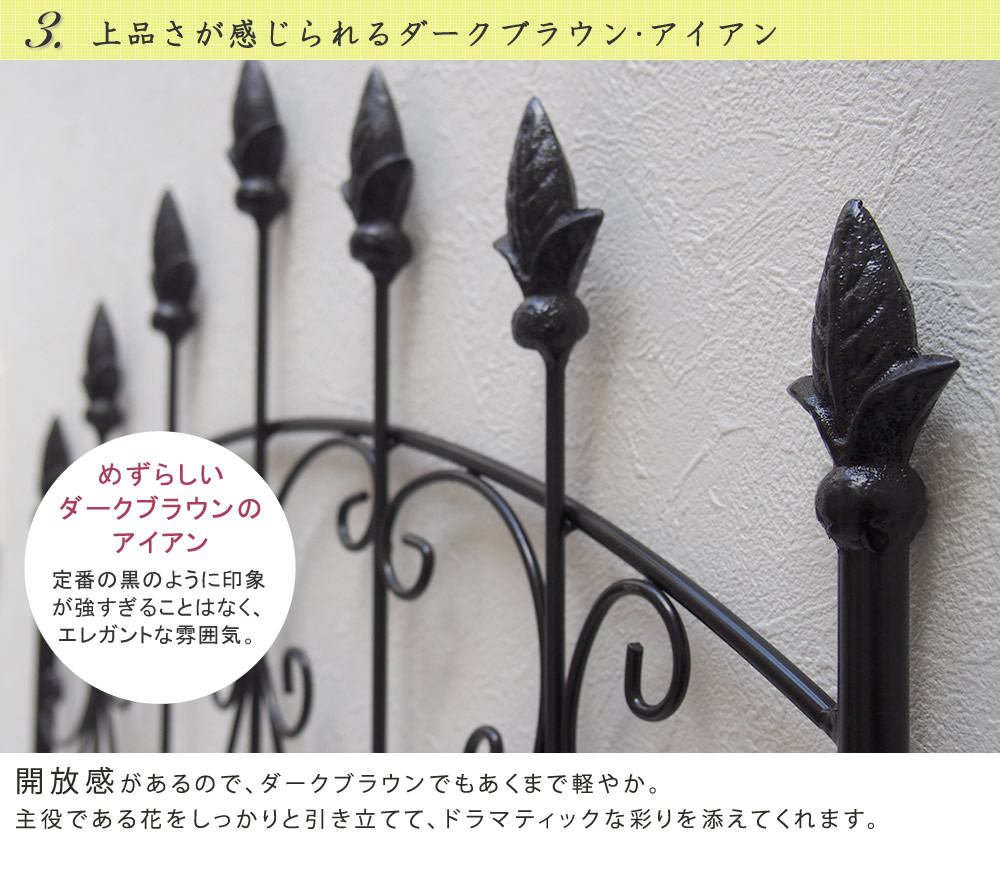硬質な印象のアイアンの中ではめずらしく、やわらかなブラウンカラーの塗装と、薔薇のツタ&薔薇のつぼみのデザインが施され、上品で華やかなイメージ。