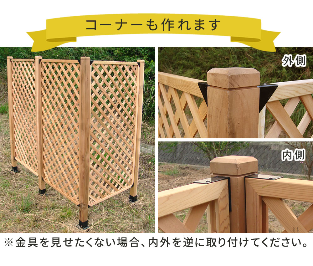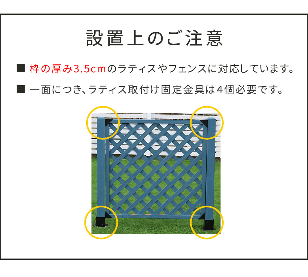 ※お庭やベランダ、店舗、公園等に、ラティスやフェンスを自作できる金具シリーズです。空間を仕切るだけでなく、日よけや、ディスプレイのベースとしても活用でき、DIY初心者さんでも簡単設置が可能。まるで作り付けのようなフェンスが設置でき、見映えのするエクステリアに。自宅に癒しの空間を。