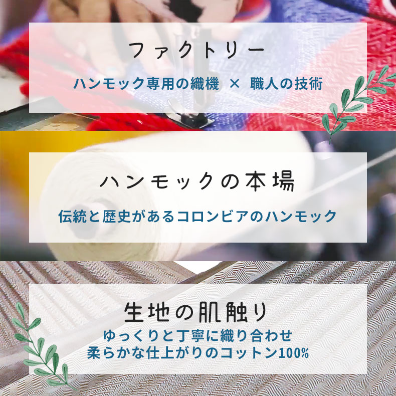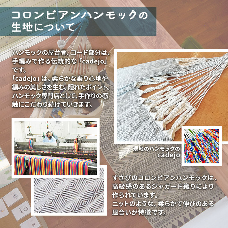 私たちは本場のハンモックを作るため、コロンビアで10を超える生産者と話し合いました。その中で、ハンモックに対する想いとこだわりを共有できる町工場の人達が、Susabiハンモックを作っています。