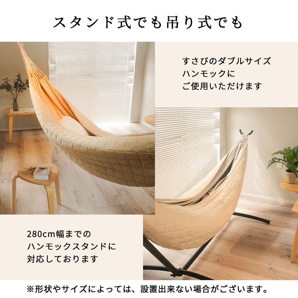 当商品はダブルサイズハンモック(寝床部の長さ:約220cm・幅:約160cm)/スタンド(幅:約268~280cm)に対応しております。