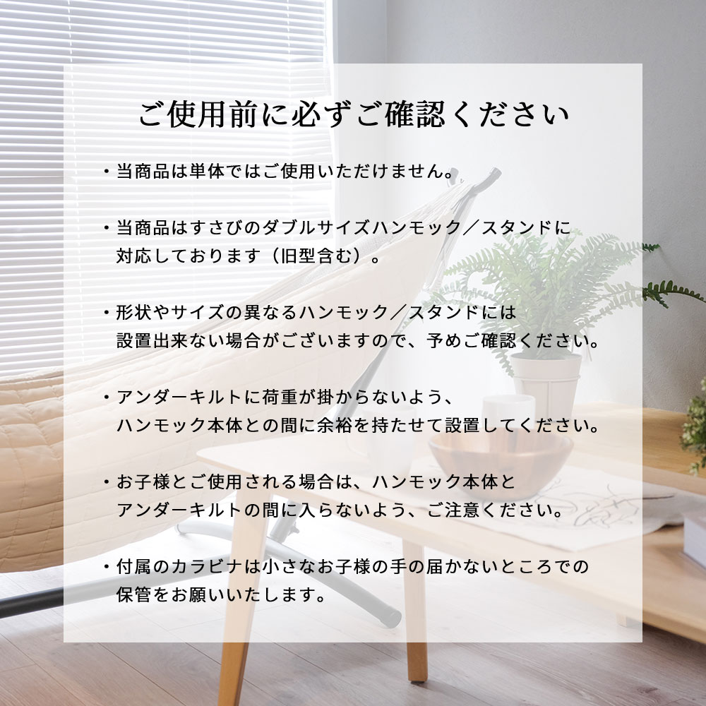お子様とご使用される場合は、ハンモック本体とアンダーキルトの間に入らないよう、ご注意ください。