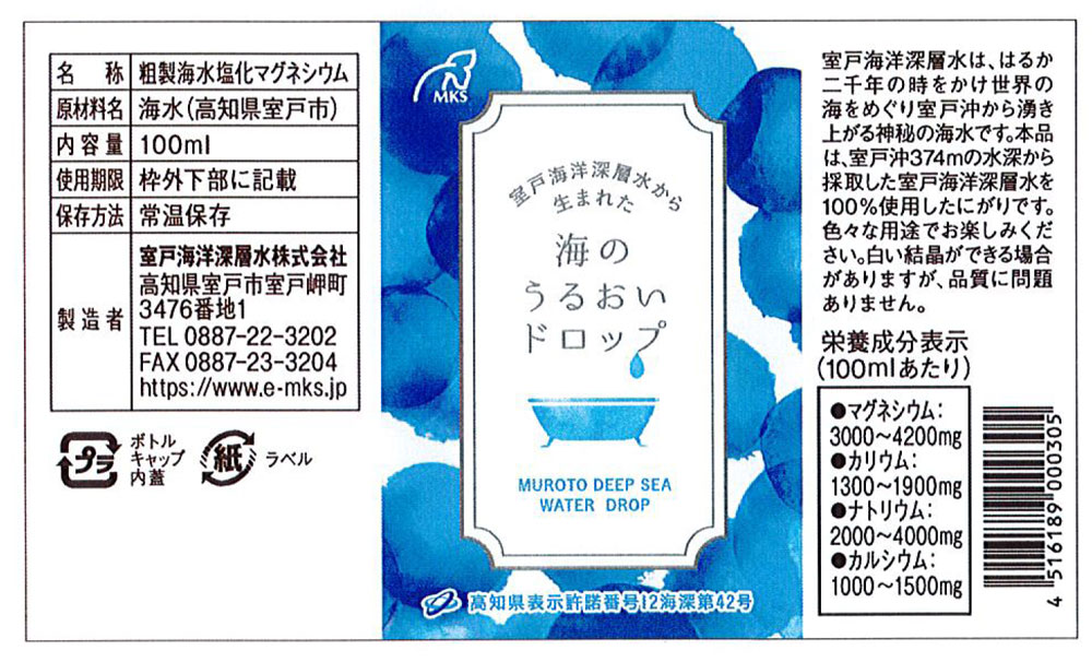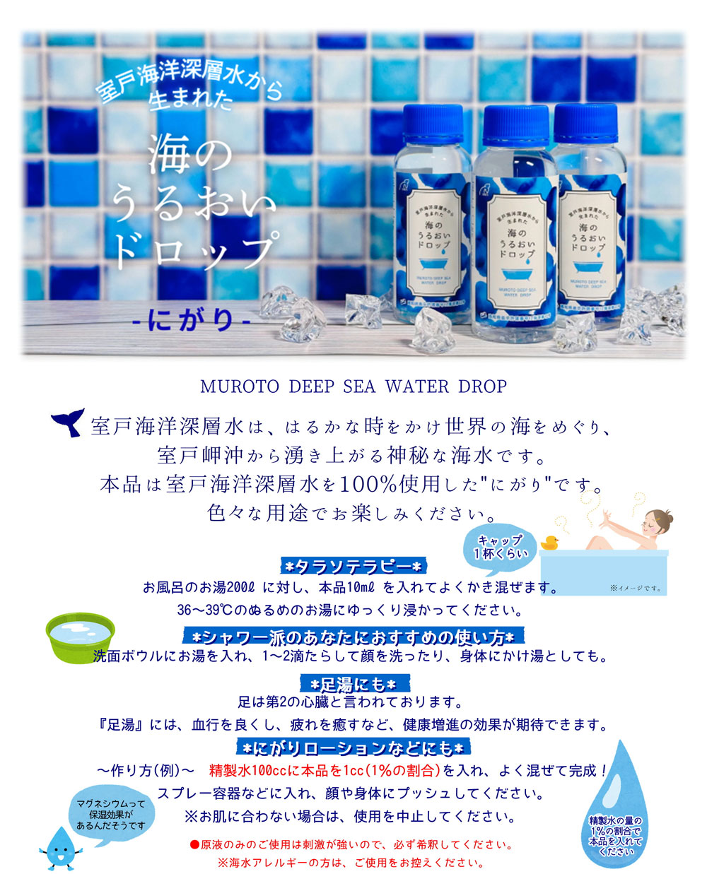 海のうるおいドロップ 100ml×10本 国産 にがり マグネシウム ミネラル 塩 入浴剤 入浴 お風呂 お湯200Lに10ml(小さじ2杯位) 36℃から39℃ ぬるめ ゆっくり リラックス 海洋深層水 ミネラル 四国 高知 室戸海洋深層水 【代引/同梱不可】