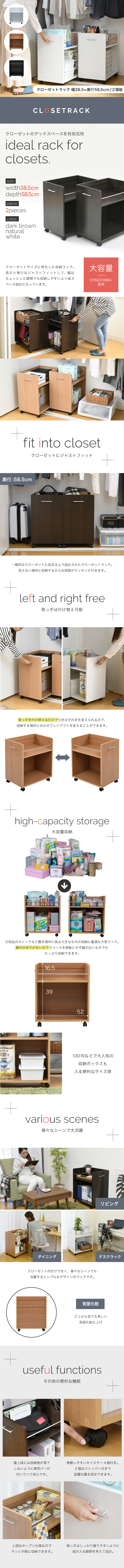 キャスター付きの便利なクローゼットラック2個組。取っ手はどちらにも取り付け可能なので、収納箇所の向きは左右入れ替えできます。幅が広いので収納場所に困る大きな日用品のストックにも最適。クローゼット内のスペースを有効活用するのでお部屋をすっきり片付けられます。