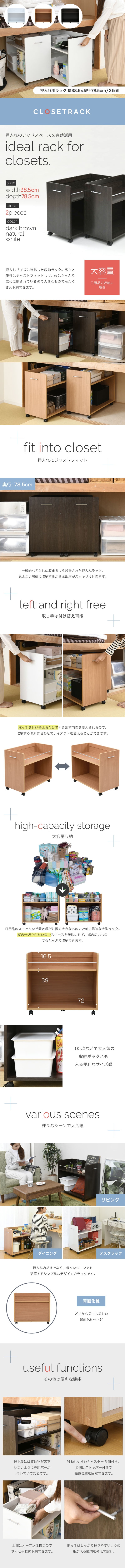 押入れ 収納 ラック 2個セット 幅38 奥行78 キャスター付き ワゴン 整理 隙間 家具 押入れ 収納 リビング 大容量 棚 スライド 収納庫 日用品 収納ケース 【同梱/代引不可】[ナチュラル]