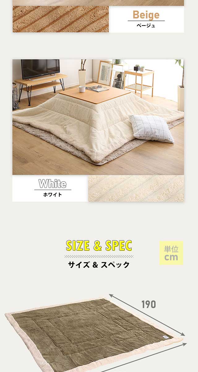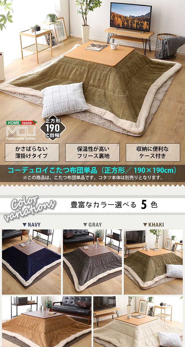 こたつ布団 薄掛けタイプ 正方形(190×190cm)単品【mou-ムー-】 収納ケース付き 掛け布団 大きい 大判 こたつ掛け布団 掛布団 薄手 シンプル[ホワイト]