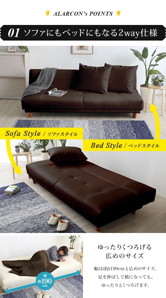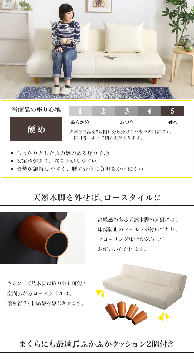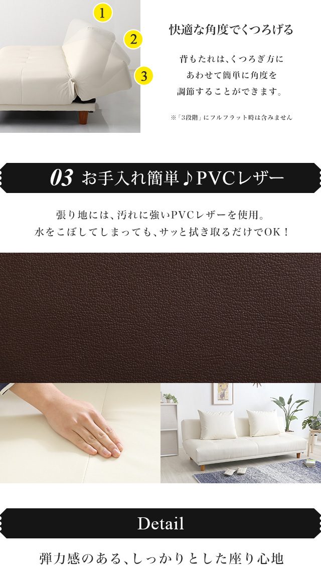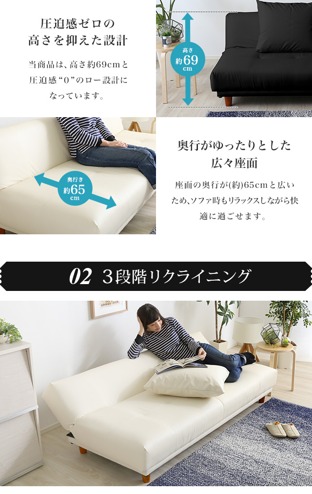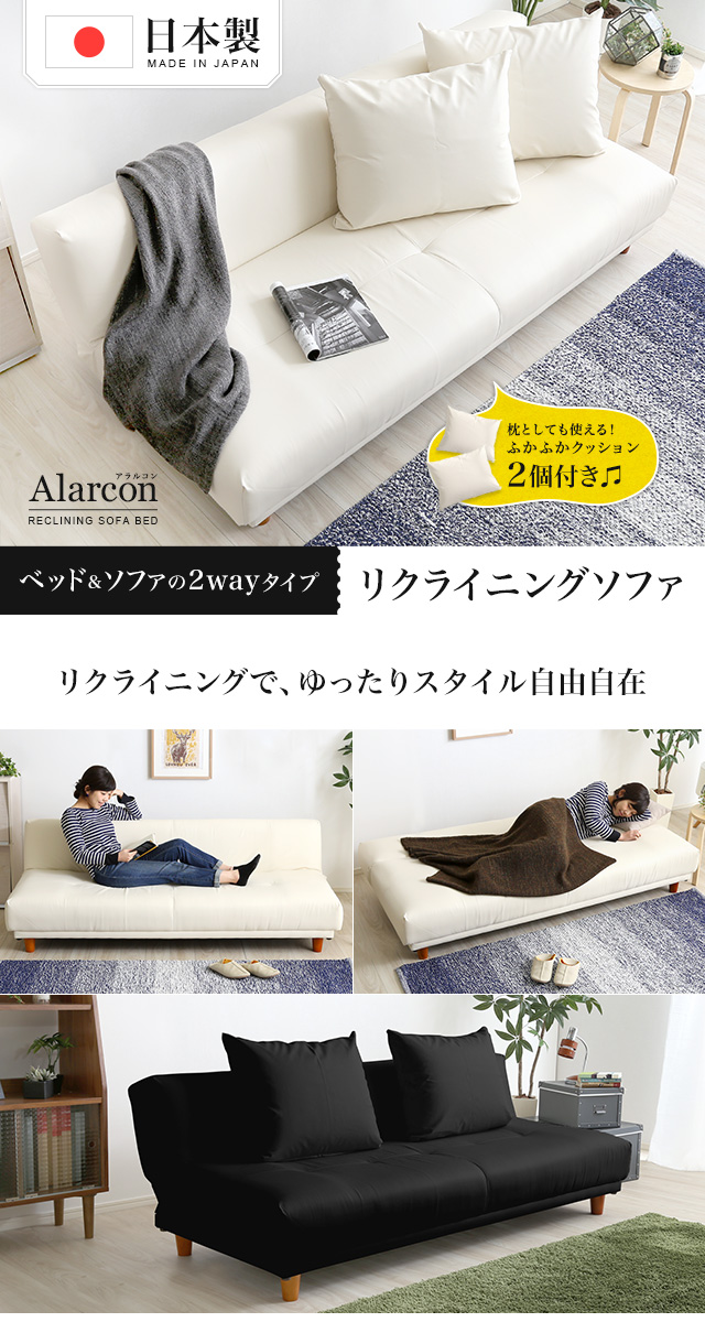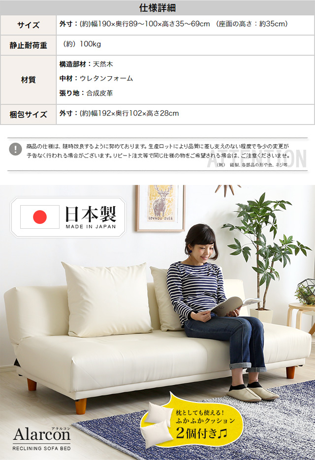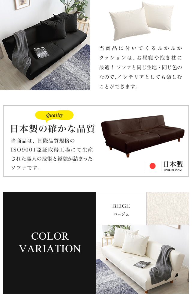クッション2個付き、3段階リクライニングソファベッド(レザー3色)ローソファにも 日本製・完成品|Alarcon-アラルコン-[ベージュ]